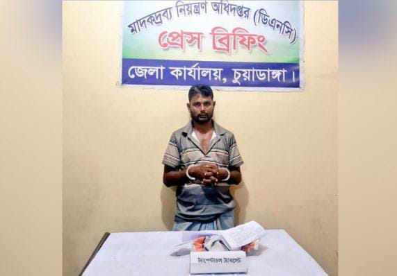 রবিবার (৫ অক্টোবর) দুপুরে পৌর শহরের শান্তিপাড়া রোডে আলামিনের চায়ের দোকানের সামনে পাকা রাস্তার ওপর থেকে তাকে আটক করা হয়। আটক মিন্টু হোসেন চুয়াডাঙ্গা জেলার দর্শনা মোবারকপাড়ার বাসিন্দা এবং মৃত দেলোয়ার হোসেনের ছেলে।