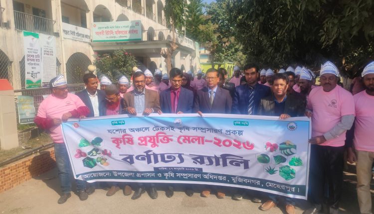মুজিবনগর প্রতিনিধি: মেহেরপুর আধুনিক ও টেকসই প্রযুক্তির মাধ্যমে কৃষি উৎপাদন বৃদ্ধি ও কৃষকদের সক্ষমতা বাড়ানোর লক্ষ্যে মেহেরপুরের মুজিবনগরে শুরু হয়েছে তিন দিনব্যাপী ‘কৃষি প্রযুক্তি মেলা-২০২৬’। মঙ্গলবার সকালে ‘যশোর অঞ্চলে টেকসই কৃষি সম্প্রসারণ প্রকল্প’-এর আওতায় উপজেলা প্রশাসন ও কৃষি সম্প্রসারণ অধিদপ্তর এই মেলার আয়োজন করে। মেলার শুভ উদ্বোধন করেন অনুষ্ঠানের প্রধান অতিথি কৃষি সম্প্রসারণ অধিদপ্তর, যশোর অঞ্চলের অতিরিক্ত পরিচালক কৃষিবিদ জনাব আলমগীর বিশ্বাস। উদ্বোধনী অনুষ্ঠানে বক্তারা বলেন, জলবায়ু পরিবর্তনের চ্যালেঞ্জ মোকাবিলায় স্মার্ট কৃষির বিকল্প নেই। টেকসই কৃষি প্রযুক্তির ব্যবহার কৃষকের উৎপাদন খরচ কমিয়ে আনবে এবং ফসলের গুণগত মান নিশ্চিত করবে। এই মেলা স্থানীয় কৃষকদের আধুনিক কৃষি যন্ত্রপাতির সঙ্গে পরিচয় করিয়ে দেওয়ার একটি বড় প্ল্যাটফর্ম। মুজিবনগর উপজেলা নির্বাহী অফিসার (ইউএনও) জনাব সাইফুল হুদা-র সভাপতিত্বে অনুষ্ঠানে বিশেষ অতিথি হিসেবে উপস্থিত ছিলেন মেহেরপুর কৃষি সম্প্রসারণ অধিদপ্তরের উপপরিচালক জনাব সনজীব মৃধা এবং যশোর অঞ্চলে টেকসই কৃষি সম্প্রসারণ প্রকল্পের পরিচালক জনাব রবিউল ইসলাম। এছাড়াও উপস্থিত ছিলেন মেহেরপুর কৃষি সম্প্রসারণ অধিদপ্তরের অতিরিক্ত উপপরিচালক (উদ্যান) জনাব জেসমিন ফেরদৌসসহ কৃষি বিভাগের স্থানীয় কর্মকর্তারা। আয়োজকরা জানান, মেলায় বিভিন্ন স্টলে আধুনিক কৃষি প্রযুক্তি, উচ্চফলনশীল জাতের প্রদর্শনী এবং জৈব সার ব্যবহারের সুফল তুলে ধরা হচ্ছে। তিন দিনব্যাপী এই মেলা প্রতিদিন সকাল ৯টা থেকে সন্ধ্যা পর্যন্ত সর্বসাধারণের জন্য উন্মুক্ত থাকবে। মেলা উপলক্ষে প্রতিদিন বিকেলে কৃষকদের নিয়ে কারিগরি সেমিনারেরও আয়োজন করা হয়েছে। এই মেলায় মোট ১৬ টি স্টল এর উদ্ভাবনী কৃষকদের মাঝে বিশেষ সম্মাননা ও পুরস্কার বিতরণ করা হবে।