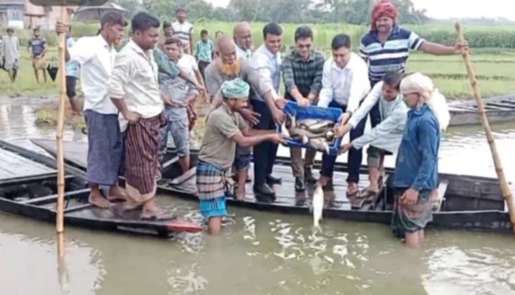 মেহেরপুর অফিস: মেহেরপুর সদর উপজেলার হরিরামপুর বিলে মাছের পোনা অবমুক্তকরণ কার্যক্রমের উদ্বোধন করা হয়েছে। গতকাল মঙ্গলবার সকালে এ কার্যক্রমের উদ্বোধন করেন অতিরিক্ত জেলা প্রশাসক তাজওয়ার আকরাম সাকাপি ইবনে সাজ্জাদ। তিনি প্রধান অতিথি হিসেবে উপস্থিত থেকে বিলে মাছের পোনা অবমুক্ত করেন। অনুষ্ঠানে বিশেষ অতিথি ছিলেন সদর উপজেলা নির্বাহী কর্মকর্তা খায়রুল ইসলাম, জেলা মৎস্য কর্মকর্তা সাধন চন্দ্র সরকার এবং সদর উপজেলা মৎস্য কর্মকর্তা কামরুন নাহার আঁখি। এ সময় আরও উপস্থিত ছিলেন হরিরামপুর বিল কমিটির সভাপতি বীর মুক্তিযোদ্ধা আব্দুস সালাম, কমিটির সদস্য মনির হোসেনসহ স্থানীয় গণ্যমান্য ব্যক্তিবর্গ ও মৎস্যজীবীরা। প্রধান অতিথি তার বক্তব্যে বলেন, ‘প্রাকৃতিক জলাশয়ে মাছের পোনা অবমুক্ত করার মাধ্যমে মৎস্য সম্পদের উৎপাদন বৃদ্ধি সম্ভব। এটি খাদ্য নিরাপত্তা নিশ্চিত করার পাশাপাশি জেলেদের জীবিকা রক্ষায় গুরুত্বপূর্ণ ভূমিকা রাখবে।’ অনুষ্ঠান শেষে অতিথিরা বিল ঘুরে দেখেন এবং মৎস্য উন্নয়ন কার্যক্রমে সন্তোষ প্রকাশ করেন।