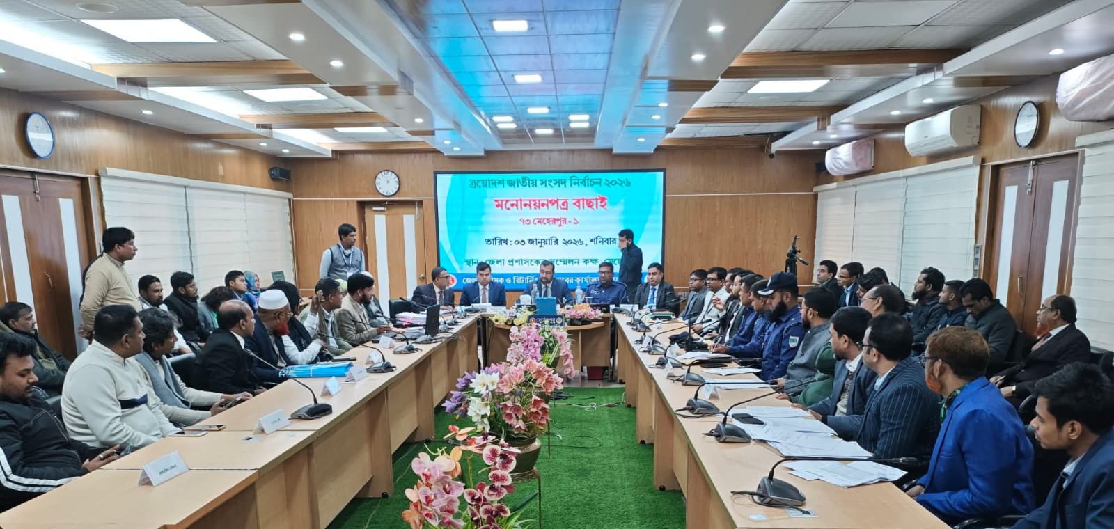 মেহেরপুর প্রতিনিধি:ত্রয়োদশ জাতীয় সংসদ নির্বাচন ২০২৬ উপলক্ষে মেহেরপুর-১ ও মেহেরপুর ২ সংসদীয় আসনের মনোনয়নপত্র বাছাই অনুষ্ঠিত হয়েছে। শনিবার জেলা প্রশাসকের সম্মেলন কক্ষে জেলা প্রশাসক ও রিটার্নিং অফিসারের উপস্থিতিতে এ বাছাই কার্যক্রম সম্পন্ন হয়। এ সময় জমাকৃত নথিতে ভুল থাকায় মেহেরপুর ১ আসনের পাঁচজন প্রার্থীকে বাতিল হিসাবে ঘোষণা করা হয়। অপরদিকে মেহেরপুর ১ আসনের চার প্রার্থী এবং মেহেরপুর ২ আসনের তিনজন প্রার্থীকে ভুল সংশোধনের সময় দেওয়া হয়। মনোনয়নপত্র বাছাইয়ের জন্য বিকেল চারটা পর্যন্ত সময় নির্ধারণ করা হয়।