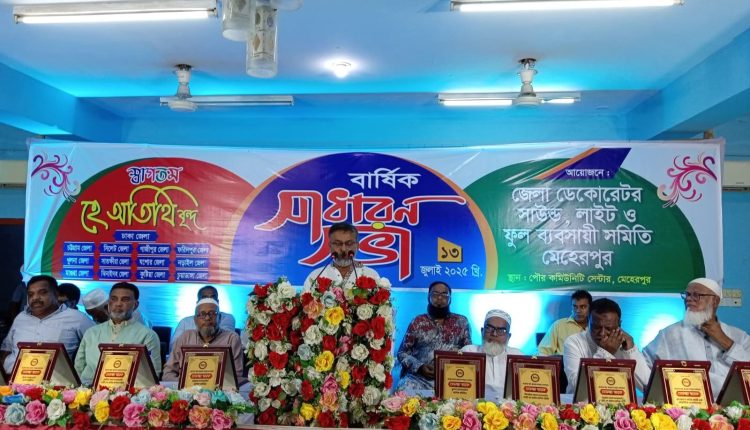 মেহেরপুর অফিস: মেহেরপুর জেলা ডেকোরেটর সাউন্ড, লাইট ও ফুল ব্যবসায়ী সমিতির বার্ষিক সাধারণ সভা অনুষ্ঠিত হয়েছে। গতকাল রোবাবর বিকেলে মেহেরপুর পৌর কমিউনিটি সেন্টারে জেলা ডেকোরেটর সাউন্ড,লাইট ও ফুল ব্যবসায়ী সমিতির বার্ষিক সাধারণ সভার আয়োজন করা হয়। সাধারণ সভা অনুষ্ঠানে মেহেরপুর জেলা ডেকোরেটর সাউন্ড,লাইট ও ফুল ব্যবসায়ী সমিতির উপদেষ্টা গোলাম মোস্তফার সভাপতিত্বে এসময় উপস্থিত ছিলেন মেহেরপুর জেলা ডেকোরেটর সাউন্ড,লাইট ও ফুল ব্যবসায়ী সমিতির সভাপতি সানোয়ার হোসেন, বাংলাদেশ লাইট অ্যান্ড লজিস্টিক এসোসিয়েশনের সাধারণ সম্পাদক নাজমুল আলম, গাজীপুর জেলা লাইটিং এন্ড সাউন্ডের সভাপতি মাসুদ রানা, ঢাকা জেলার প্রতিনিধি হাজী মোহাম্মদ জানে আলম, কুষ্টিয়া জেলা ডেকোরেটর মালিক সমিতির সভাপতি আসাদুজ্জামান, সাতক্ষীরা ডেকোরেটর মালিক সমিতির সভাপতি রবিউল ইসলাম গাজী, নড়াইল জেলা ডেকোরেটর মালিক সমিতির সভাপতি সাফায়েত হোসেন, যশোর জেলা ডেকোরেটর মালিক সমিতির সভাপতি গোলক দত্ত, সিলেট জেলা ডেকোরেটর মালিক সমিতির সভাপতি আব্দুল জাব্বার, চুয়াডাঙ্গা জেলা ডেকোরেটর মালিক সমিতির সভাপতি খসরুল আলম সহ মেহেরপুর জেলার ডেকোরেটর সাউন্ড, লাইট ফুল ব্যবসায়ীরা উপস্থিত ছিলেন।