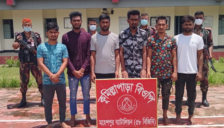 মহেশপুর প্রতিনিধি: ভারত থেকে অবৈধভাবে বাংলাদেশে প্রবেশের দায়ে ঝিনাইদহের মহেশপুর সীমান্তে নারীসহ ১৭জনকে আটক করেছে বিজিবি। আটককৃতরা খুলনা ও নড়াইল জেলার বাসিন্দা। গতকাল বৃহস্পতিবার মহেশপুর উপজেলার বাঘাডাঙ্গা, কুমিল্লাপাড়া ও খোসালপুর বিওপি’র পৃথক অভিযানে তাদের আটক করা হয়। মহেশপুর ৫৮ বিজিবির সহকারী পরিচালক মুন্সী ইমদাদুর রহমানের পাঠানো এক প্রেস বিজ্ঞপ্তিতে এ তথ্য নিশ্চিত করা হয়েছে। বিজ্ঞপ্তিতে বলা হয়েছে, বৃহস্পতিবার সকাল সাড়ে ১০টায় বাঘাডাংগা গ্রামের মাঠ ৭ বাংলাদেশি নাগরিককে আটক করে বিজিবি। আটককৃতরা অবৈধভাবে সীমান্ত পেরিয়ে ভারত থেকে বাংলাদেশে প্রবেশ করে। তাদের বাড়ী নড়াইল ও খুলনা জেলায়। এছাড়া দুপুর সাড়ে ১২টার দিকে কুমিল্লাপাড়া বিওপি’র পৃথক অভিযানে জিনজিরাপাড়া গ্রামের মাঠের মধ্যে হতে ৬ জনকে আটক করা হয়। খোসালপুর বিওপির অপর এক অভিযানে দুপুর ১টার দিকে আরও ৪ জন (নারী) বাংলাদেশী নাগরিক আটক করা হয়। আটক নারীদের যশোর জাস্টিস এন্ড কেয়ার সেন্টারে পাঠানো হয়েছে। আটক পুরুষদের মহেশপুর থানায় সোপর্দ করেছে বিজিবি। আটক নারীদের যশোর জাস্টিস অ্যান্ড কেয়ার সেন্টারে পাঠানো হয়েছে। আর পুরুষদের মহেশপুর থানায় সোপর্দ করেছে বিজিবি। মহেশপুর থানার ওসি সাজ্জাদুর রহমান বলেন, ‘‘আটককৃতদের বিরুদ্ধে আইনানুগ ব্যবস্থা নেওয়া হবে। মামলা দায়েরের মাধ্যমে তাদের আদালতে পাঠানো হবে।’