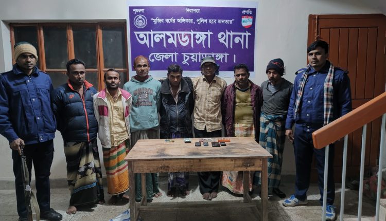 আলমডাঙ্গা ব্যুরো: আলমডাঙ্গা থানা পুলিশ এরশাদপুর গ্রামে জুয়া বিরোধী অভিযান চালিয়ে জুয়ার আসর থেকে ৭ জনকে গ্রেফতার করেছে। গতকাল মঙ্গলবার রাত সাড়ে ৮টার দিকে গোপন সংবাদের ভিত্তিতে এরশাদপুর গ্রামের শরিফুলের বাড়িতে অভিযান চালিয়ে জুয়াখেলারত অবস্থায় ৭ জনকে গ্রেফতার করে নিয়ে আসে। জুয়ার আসর খেকে নগদ টাকাসহ জুয়া খেলার সরাঞ্জাম উদ্ধার করেন। জানা গেছে, আলমডাঙ্গা পৌর এলাকার এরশাদপুর গ্রামের মৃত ছকিম উদ্দিনের ছেলে শরিফুলের বাড়িতে নিয়মিত সন্ধ্যার পর জুয়া আসর বসিয়ে বেশ কয়েকজন জুয়া খেলা করতো। এমন গোপন সংবাদের ভিত্তিতে আলমডাঙ্গা থানার পুলিশ পরিদর্শক অপারেশন একরামুল হোসাঈনের নেতৃত্বে এসআই সালাউদ্দিন, এসআই দেবাশিষ অভিযান চালান। এ সময় বাড়ির মালিক মৃত ছকিমের ছেলে শরিফুল ইসলাম (৩৫), একই গ্রামের মিনহাজ উদ্দিনের ছেলে সাজু বিশ্বাস (৩৭), মৃত শাহাদত হোসেনের ছেলে রাজিব আহম্মেদ ওরফে শিমুল (৩২), আলফা উদ্দিনের ছেলে রাশেদ (৪৫), আতিয়ার রহমানের ছেলে টুকু (৫০), মৃত খবির উদ্দিনের ছেলে কুদ্দুস (৫০), মৃত বাবুর আলীর ছেলে আইনুদ্দিন (৫৮) কে আটক করে। অভিযানকালে পুলিশ তাদের কাছ থেকে নগদ ২ হাজার ২শ’ ৮০ টাকা ও ২ সেট তাস উদ্ধার করেন। এ ঘটনায় আটকৃতদের বিরুদ্ধে জুয়া আইনে মামলা দায়ের করা হয়েছে।