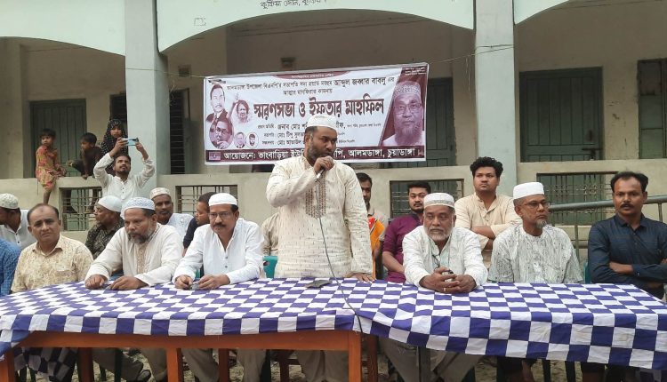 হাটবোয়ালিয়া প্রতিনিধি: আলমডাঙ্গা উপজেলার বিএনপির প্রয়াত সভাপতি আব্দুল জব্বার বাবলুর মৃত্যুতে মাগফেরাত কামনায় দোয়া স্মরণসভা ও ইফতার মাহফিল অনুষ্ঠিত হয়েছে। ভাংবাড়িয়া ইউনিয়ন বিএনপির আয়োজনে গতকাল মঙ্গলবার বিকেলে ভাংবাড়িয়া মাদরাসা প্রাঙ্গণে এই স্মরণসভা ও ইফতার মাহফিল অনুষ্ঠিত হয়। সভাপতিত্ব করেন ইউনিয়ন বিএনপির সভাপতি টিপু সুলতান। প্রধান অতিথি ছিলেন চুয়াডাঙ্গা জেলা বিএনপির সদস্য সচিব মো. শরীফুজ্জামান শরীফ। প্রধান অতিথির বক্তব্যে বলেন, আব্দুল জব্বার বাবলুর মৃত্যু দলের জন্য অপুরণীয় ক্ষতি। তিনি আমৃত্যু দলের জন্য সংগ্রাম করে গেছেন। তিনি ছিলেন অনুকরণীয় আদর্শ, তার সংগ্রামকে বিজয়ের রূপ দিতে হলে আপনাদেরকে চূড়ান্ত প্রস্তুতি নিতে হবে। বিশেষ অতিথি ছিলেন জেলা বিএনপির আহবায়ক কমিটির সদস্য খন্দকার আব্দুল জব্বার সোনা, জেলা বিএনপির আহবায়ক কমিটির সদস্য ও আলমডাঙ্গা উপজেলা বিএনপির সাধারণ সম্পাদক মো. আমিনুল হক রোকন, জেলা বিএনপির আহবায়ক কমিটির সদস্য ও আলমডাঙ্গা পৌর বিএনপির সভাপতি মো আজিজুর রহমান পিন্টু, জেলা বিএনপির আহবায়ক কমিটির সদস্য ও আলমডাঙ্গা পৌর বিএনপির সাধারণ সম্পাদক মো. জিল্লুর রহমান ওল্টু, আলমডাঙ্গা উপজেলার বিএনপির সিনিয়র সহ-সভাপতি মো. আক্তার হোসেন জোয়ার্দ্দার, সাংগঠনিক সম্পাদক আনোয়ার হোসেন, আলমডাঙ্গা উপজেলা বিএনপির নেতা এমদাদুল হক ডাবু, জেলা জাসাস এর সাধারণ সম্পাদক মো. সেলিমুল হাবিব সেলিম, চুয়াডাঙ্গা সদর উপজেলা বিএনপির যুগ্ম সম্পাদক আবুল কামাল আজাদ, ভাংবাড়িয়া ইউনিয়ন বিএনপি সাধারণ সম্পাদক মো. আতাউল হুদার সঞ্চালনায় আরো উপস্থিত ছিলেন জেলা ছাত্রদলের সিনিয়র যুগ্মসম্পাদক মো. জুয়েল মাহমুদ, যুগ্মসম্পাদক আমানুল্লাহ আমান, যুগ্মসম্পাদক আরিফ আহমেদ শিপ্লব, সাইমুজ্জামান মিশা, জেলা স্বেচ্ছাসেবক দলের সহ-সভাপতি এহসানুল হক স্বরাজ, আলমডাঙ্গা উপজেলা যুবদলের সদস্য সচিব মো. রফিকুল ইসলাম, পৌর যুবদলের সদস্য সচিব সাইফুল আলম কনক আলমডাঙ্গা ছাত্রদলের সভাপতি জাহিদ হাসান শুভ।