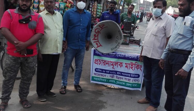 ডিঙ্গেদহ প্রতিনিধি: মহামারী করোনা ভাইরাস প্রতিরোধে স্থানীয় স্বাস্থ্যকেন্দ্রে গিয়ে করোনা ভ্যাকসিন গ্রহণ ও জনসচেতনতা সৃষ্ঠির লক্ষ্যে প্রচারণামূলক মাইকিংয়ের উদ্বোধন করা হয়। গতকাল সোমবার সকাল ৯টায় শঙ্করচন্দ্র ইউপি চেয়ারম্যান বীর মুক্তিযোদ্ধা আব্দুর রহমান এ কার্যক্রমের উদ্বোধন করেন। এডাব চুয়াডাঙ্গা জেলা কমিটির সহযোগিতায় পল্লী উন্নয়ন সংস্থা পাস চুয়াডাঙ্গা সদরের শঙ্করচন্দ্র ইউনিয়নে এ প্রচারণামূলক কার্যক্রম পরিচালনা করেন। এ সময় আরও উপস্থিত ছিলেন চুয়াডাঙ্গা জেলা জাতীয় পার্টির সিনিয়র সহ-সভাপতি শাহাবুদ্দিন বিশ^াস খোকন, চুয়াডাঙ্গা সদর উপজেলা আ.লীগের সাধারণ সম্পাদক শাহাদত হোসেন, পাস’র নির্বাহী পরিচালক ইলিয়াস হোসেন, শঙ্করচন্দ্র ইউনিয়নের প্যানেল চেয়ারম্যান শওকত মাহামুদ, ইউপি সচিব আশাবুল হক মাসুদ। এছাড়াও জীবননগর এলাকায় উষা বাংলাদেশ, চুয়াডাঙ্গা জেলায় রিসো, গোকুলখালী এলাকায় গ্রামীণ সমাজ উন্নয়ন সংস্থা, সরোজগঞ্জ এলাকায় কম্প্যাক্ট ফাউন্ডেশন মাইকিং করে।