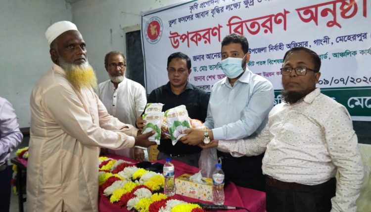 গাংনী প্রতিনিধি: তুলা উৎপাদন বাড়াতে মেহেরপুরের গাংনীতে ২০২৫-২৬ মৌসুমে আবাদের জন্য ক্ষুদ্র ও প্রান্তিক কৃষকদের মাঝে বিনামূল্যে উপকরণ বিতরণ করা হয়েছে। গকতাল বুধবার বিকেলে গাংনী সিদ্দিকিয়া সিনিয়র আলিয়া মাদরাসার হলরুমে এ অনুষ্ঠানের আয়োজন করে তুলা উন্নয়ন বোর্ড। অনুষ্ঠানে সভাপতিত্ব করেন তুলা উন্নয়ন বোর্ডের কুষ্টিয়া অঞ্চলের প্রধান তুলা উন্নয়ন কর্মকর্তা শেখ আল মামুন। প্রধান অতিথি হিসেবে উপস্থিত ছিলেন গাংনী উপজেলা নির্বাহী কর্মকর্তা আনোয়ার হোসেন। বিশেষ অতিথি ছিলেন ড. মোহাম্মদ তাসদিকুর রহমান। অনুষ্ঠানে গাংনী উপজেলার বিভিন্ন এলাকার তুলা চাষিরা অংশ নেন। প্রণোদনা কর্মসূচির আওতায় ৬জন চাষীকে ৬শ গ্রাম করে তুলা বীজ, বোরণ সার ২ কেজি, ২৫ কেজি ইউরিয়া, ৫০ কেজি এমওপি এবং ৫০ কেজি টিএসপিসহ বিভিন্ন প্রকার কীটনাশক প্রদান করা হয়। অনুষ্ঠানে বক্তারা তুলা উৎপাদন বৃদ্ধি ও কৃষকদের জীবনমান উন্নয়নের লক্ষ্যে সরকারের এ ধরনের সহায়তা অব্যাহত রাখার ওপর গুরুত্বারোপ করেন।