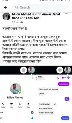 জানা গেছে, মিলন আহম্মেদ নামে ইংরেজীতে একটি ফেসবুক আইডি রয়েছেন যার মালিক মিলন আহম্মেদ। এ আইডিতে মিলন হোসেনের পঞ্চাবি গায়ে দেয়া ফুল সাইজের একটি ছবি রয়েছে প্রোফাইলে। অপরদিকে তার পুরানো একটি হাফ ছবি ব্যবহার করে একই নামে আরেকটি আইডি খোলা হয়েছে। যে আইডির ম্যাসেঞ্জারে টাকা দাবি করা হয়েছে তার স্বজনদের কাছে। এ বিষয়ে নিজের আইডিতে একটি সতর্কীকরণ নোটিশ দিয়েছেন মিলন।