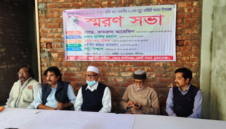 স্টাফ রিপোর্টার: চুয়াডাঙ্গায় মজলুম জননেতা মওলানা আব্দুল হামিদ খান ভাসানীর ৪৬তম মৃত্যুবার্ষিকী উপলক্ষে স্মরণসভা অনুষ্ঠিত হয়েছে। ভাসানী অনুসারী পরিষদ চুয়াডাঙ্গা জেলা কমিটির আয়োজনে গতকাল শনিবার বেলা ১২টায় চুয়াডাঙ্গা শহরের কোর্টপাড়ায় সংগঠনটির জেলা কার্যালয়ে এ সভা অনুষ্ঠিত হয়। ভাসানী অনুসারী পরিষদ চুয়াডাঙ্গা জেলা কমিটির সভাপতি লিটু বিশ্বাসের সভাপতিত্বে স্মরণ সভায় প্রধান অতিথি হিসেবে বক্তব্য রাখেন, মহকুমা ন্যাপ (ভাসানী) এর সাবেক সভাপতি অ্যাড. কামরুল আরেফিন। সভায় বিশেষ অতিথি হিসেবে বক্তব্য রাখেন, বাংলাদেশের কমিউনিস্ট পার্টি চুয়াডাঙ্গা জেলা কমিটির সাবেক সাধারণ সম্পাদক লুৎফর রহমান, বাংলাদেশ যুব মৈত্রীর কেন্দ্রীয় সহ-সাংগঠনিক সম্পাদক মামুন অর রশিদ, বাংলাদেশ উদীচী শিল্পীগোষ্ঠী চুয়াডাঙ্গা জেলা সংসদের সভাপতি হাবিবি জহির রায়হান, চুয়াডাঙ্গা জেলা সাংস্কৃতিক জোটের আহ্বায়ক মো. আলাউদ্দীন, অধ্যাপক হাফিজ উদ্দীন প্রমুখ। সভায় বক্তারা বলেন, মওলানা আব্দুল হামিদ খান ভাসানী সবসময় ব্যক্তিস্বার্থের ঊর্ধ্বে জাতীয় স্বার্থকে প্রাধান্য দিয়েছেন। তার (ভাসানীর) অত্যন্ত সাদাসিধে জীবনযাপন দেশ ও জনগণের প্রতি তার গভীর ভালোবাসারই প্রতিফলন। শোষণ-বঞ্চনাহীন ও প্রগতিশীল, গণতান্ত্রিক এবং অসাম্প্রদায়িক বাংলাদেশ গঠনের জন্য মওলানা ভাসানী আজীবন সংগ্রাম করে গেছেন। মওলানা আব্দুল হামিদ খান ভাসানী অধিকারবঞ্চিত অবহেলিত মেহনতি মানুষের অধিকার ও স্বার্থরক্ষায় আজীবন নিরবচ্ছিন্নভাবে সংগ্রাম করে গেছেন। জাতীয় সঙ্কটে জনগণের পাশে থেকে দুর্বার আন্দোলন গড়ে তুলতে জনগণকে উদ্বুদ্ধ করতেন। ব্যক্তি জীবনে তিনি ছিলেন নির্মোহ, অনাড়ম্বর ও অত্যন্ত সাদাসিধে। তার সাধারণ জীবনযাপন এ দেশ ও জনগণের প্রতি গভীর ভালোবাসার প্রতিফলন। শোষণ ও বঞ্চনাহীন, প্রগতিশীল, গণতান্ত্রিক, অসাম্প্রদায়িক বাংলাদেশ গঠনের জন্য মওলানা ভাসানী আজীবন সংগ্রাম করে গেছেন।