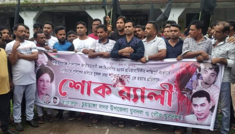 স্টাফ রিপোর্টার: চুয়াডাঙ্গায় যুবদলের উদ্যোগে শোকর্যালি ও সমাবেশ অনুষ্ঠিত হয়েছে। নারায়নগঞ্জে বিএনপির ৪৪তম প্রতিষ্ঠাবার্ষিকীর শান্তিপূর্ণ র্যালিতে পুলিশের গুলিতে যুবদল নেতা শাওন প্রধানকে হত্যার প্রতিবাদে গতকাল শনিবার সদর উপজেলা যুবদল ও পৌর যুবদল সাহিত্য পরিষদ প্রাঙ্গণে এ অনুষ্ঠানের আয়োজন করে।