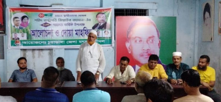 স্টাফ রিপোর্টার: বিএনপির প্রতিষ্ঠাতা জিয়াউর রহমানের ৪২তম মৃত্যুবার্ষিকী উপলক্ষে চুয়াডাঙ্গায় আলোচনাসভা ও দোয়া মাহফিল অনুষ্ঠিত হয়েছে। গতকাল শুক্রবার বিকেলে জেলা বিএনপির কার্যালয়ে জেলা মৎসজীবী দল এ আয়োজন করেন। জেলা মৎসজীবী দলের যুগ্ম আহ্বায়ক কামরুজ্জামান বাবলুর সভাপতিত্বে সভায় প্রধান অতিথি থেকে বক্তব্য দেন জেলা বিএনপির আহ্বায়ক কমিটির সদস্য ও পৌর বিএনপির সভাপতি সিরাজুল ইসলাম মনি। সভায় বিশেষ অতিথি থেকে বক্তব্য দেন জেলা বিএনপির সদস্য আবু বক্কর সিদ্দিক আবু। চুয়াডাঙ্গা সেচ্ছাসেবক দলের সভাপতি শফিকুল ইসলাম পিটুর সঞ্চালনায় সভায় আরও বক্তব্য দেন জেলা যুবদলের সাধারণ সম্পাদক সাইফুর রশিদ ঝন্টু, সাংগঠনিক সম্পাদক জাহেদ মোহাম্মদ রাজিব খান, জেলা জাসাসের সাধারণ সম্পাদক সেলিমুল হাবিব সেলিম, জেলা কৃষক দলের যুগ্ম আহ্বায়ক তরিকুল আলম জোয়ার্দার বিলু, চুয়াডাঙ্গা পৌর বিএনপির যুগ্ম সম্পাদক হাফিজুর রহমান মুক্ত। আলোচনা সভায় বক্তারা বলেন, শহীদ রাষ্ট্রপতি জিয়াউর রহমান শুধু স্বাধীনতার ঘোষকই ছিলেন না, তিনি বহুদলীয় গণতন্ত্রের প্রবক্তাও ছিলেন। এদেশে জিয়ার জন্ম না হলে দেশে আজীবন বাকশালি শাসন চলতো। তারই সহধর্মিণী ও আপোষহীন নেত্রী বেগম খালেদা জিয়াকে আজ গণতন্ত্রের দুষমন আওয়ামী লীগ ষড়যন্ত্র করে অন্তরীণ করে রেখেছে। এ সময় উপস্থিত ছিলেন, চুয়াডাঙ্গা সদর উপজেলা যুবদলের ভারপ্রাপ্ত আহ্বায়ক মতিউর রহমান মিশর, যুগ্ম আহ্বায়ক নাজমুল হক, হাফিজুর রহমান হাফিজুল, নাজমুল, আলমডাঙ্গা পৌর যুবদলের সদস্য সচিব সাইফুল আলম কনক, জেলা ছাত্রদলের সাহিত্য বিষয়ক সম্পাদক ইমরান হোসেন, চুয়াডাঙ্গা পৌর ছাত্রদলের সদস্য সচিব মাজেদুল আলম মেহেদী, শাহারুজ্জামান শাহারু প্রমুখ।