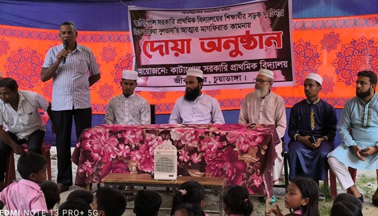 হাসাদাহ প্রতিনিধি: জীবননগর উপজেলার কাটাপোল সরকারি প্রাথমিক বিদ্যালয়ের শিক্ষার্থী তাকিয়া সুলতানার সড়ক দুর্ঘটনায় মৃত্যুতে আত্মার মাগফিরত কামনায় দোয়া মাহফিল অনুষ্ঠিত হয়েছে। গতকাল রোববার কাটাপোল সরকারি প্রাথমিক বিদ্যালয়ের উদ্যোগে এ দোয়া মাহফিল আয়োজন করা হয়। দোয়া মাহফিলে স্কুলের প্রধান শিক্ষক আক্তারুজ্জামানের সভাপতিত্বে প্রধান অতিথি হিসেবে বক্তব্য রাখেন ছালমান। বিশেষ অতিথি হিসেবে বক্তব্য রাখেন জীবননগর উপজেলার শ্রমিক কল্যাণ ফেডারশের সভাপতি কামাল উদ্দীন, ওয়ার্ড বিএনপি সভাপতি ওয়াদুদ, হাসাদাহ ইউপি সদস্য আতিকুজ্জামান সন্টু, হাসাদাহ ইউনিয়ন যুবদলের নেতা হাসানুজ্জামান হাসান, পল্লী চিকিৎসক পলাশ, নিহত শিক্ষার্থীর পিতা তরিকুল ইসলাম, স্কুলের শিক্ষক মতিয়ার রহমান, রবিউল ইসলাম জালু প্রমুখ। এছাড়াও উপস্থিত ছিলেন গ্রামবাসী ও স্কুলের শিক্ষার্থীরা।