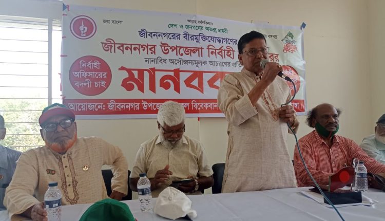 তিনি অভিযোগ করে আরও বলেন, বীর মুক্তিযোদ্ধা দলিল উদ্দিনের সাথে আক্রমণাত্মক কথা বলেন। এসব কারণে উপজেলা নির্বাহী অফিসারের বদলির দাবিতে মানববন্ধনের সিদ্ধান্ত নিই। এরপর বিষয়টি জানাজানি হলে জীবননগর, দামুড়হুদা, দর্শনা থানার ওসিরা স্থানীয় সংসদ সদস্য আলী আজগার টগরের সাথে কথা বলেন। ওসিরা আমাদের বলেন, জীবননগর চৌরাস্তা মোড়ে মানববন্ধন না করে মুক্তিযোদ্ধা কমপ্লেক্স ভবনে মানববন্ধন কর্মসূচি পালন করেন। হঠাৎ করে সকালে অতিরিক্ত জেলা প্রশাসক মুক্তিযোদ্ধা কমপ্লেক্স ভবনে এসে মুক্তিযোদ্ধা নেতৃবৃন্দের সাথে বসেন। তিনি জানান (অতিরিক্ত জেলা প্রশাসক) আপনারা মানববন্ধন কর্মসূচি স্থগিত করেন। আর বিষয়টি স্থানীয় সংসদ সদস্য ও জেলা প্রশাসক মুক্তিযোদ্ধাদের সাথে বসে ঠিক করবেন।