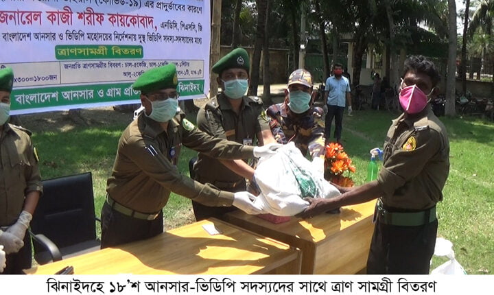 ঝিনাইদহে ১৮’শ দুস্থ আনসার ও ভিডিপি সদস্যদের মাঝে ত্রাণ সামগ্রী বিতরণ করা হয়েছে। শনিবার সকালে শহরের আনসার ও ভিডিপি কার্যালয়ে এ খাদ্যাসামগ্রী বিতরণ করা হয়। সামাজিক দুরত্ব বজায় রেখে আগতদের হাতে খাদ্যসামগ্রী তুলে দেন জেলা কমান্ড্যান্ট সনজয় কুমার সাহা। চাল, ডাল, আলু, তেলসহ নিত্যপ্রয়োজনীয় খাদ্যসামগ্রী পেয়ে খুশি হতদরিদ্ররা। জেলা কমান্ড্যান্ট সনজয় কুমার সাহা জানান, বাংলাদেশ আনসার ও ভিডিপি’র মহাপরিচালক মেজর জেনারেল কাজী শরীফ কায়কোবাদ’র নির্দেশে ঝিনাইদহ সদরসহ ৬ উপজেলায় মোট ১৮’শ জনকে এ খাদ্য সামগ্রী বিতরণ করা হয়।
