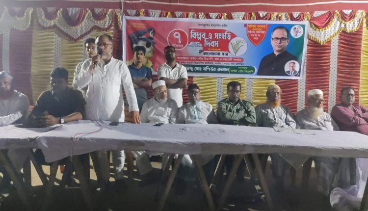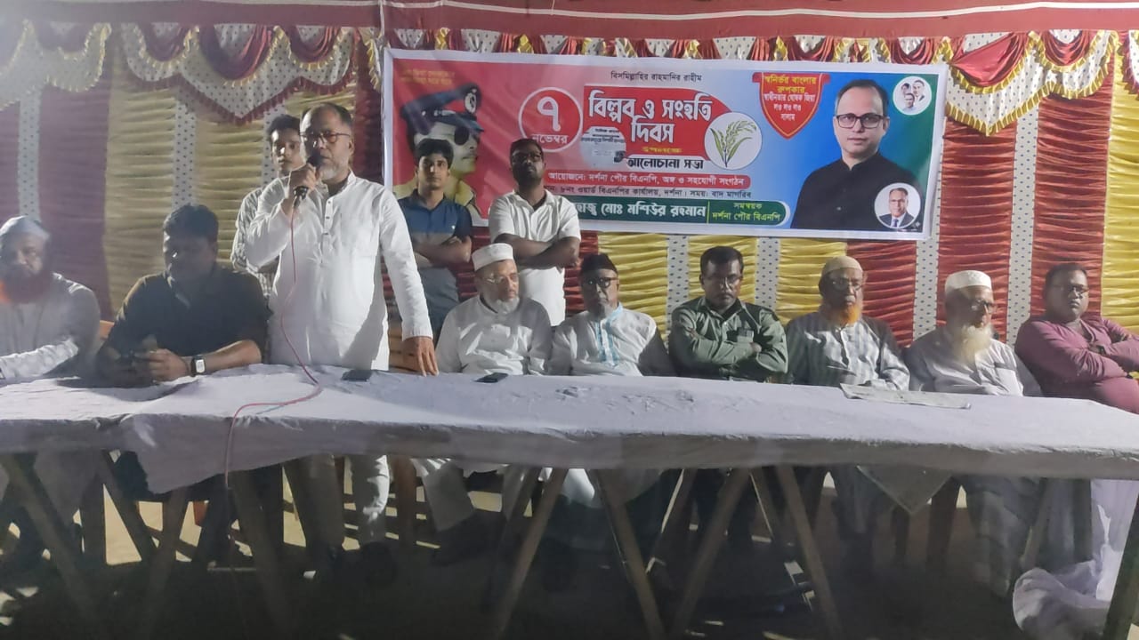 দর্শনা অফিস: ঐতিহাসিক ৭ নভেম্বর জাতীয় বিপ্লব ও সংহতি দিবস দর্শনায় যথাযথ মর্যাদার সাথে পালন করেছে বাংলাদেশ জাতীয়তাবাদি দল বিএনপি এবং অঙ্গসংগঠন। গতকাল শুক্রবার সকালে দর্শনা পুরাতন বাজারস্থ অস্থায়ী কার্যালয়ে জাতীয় ও দলীয় পতাকা উত্তোলন করেন হাবিবুর রহমান বুলেট সহ নেতৃবৃন্দ। বিকালে দর্শনা কেরুজ বাজার মাঠে যুবদল ও ছাত্রদলের মধ্যে প্রীতি ফুটবল ম্যাচ অনুষ্ঠিত হয়। সন্ধ্যায় দর্শনা পুরাতন বাজারস্থ অস্থায়ী কার্যালয়ে দর্শনা পৌর বিএনপির আয়োজন করা হয় আলোচনাসভা। পৌর এলাকার বিভিন্ন ওয়ার্ড ও পাড়া-মহল্লা থেকে বিএনপি, যুবদল ও ছাত্রদলের নেতাকর্মিরা খন্ডখন্ড মিছিল সহকারে সভাস্থরে সমবেত হয়। দর্শনা পৌর বিএনপির প্রধান সমন্বয়ক হাবিবুর রহমান বুলেটের সভাপতিত্বে সভায় প্রধান আলোচক ছিলেন, জেলা শ্রমিকদলের সাধারণ সম্পাদক শফিকুর তরফদার সাবু। বিশেষ অতিথি ছিলেন, দর্শনা পৌর বিএনপির সমন্বয়ক কমিটির সদস্য সংবাদিক শরীফ উদ্দীন, লুতফর রহমান, জেলা শ্রমিকদলের যুগ্নসম্পাদক হারুন অর রশিদ, সাঈদ আহমেদ ফারুক, দর্শনা পৌর যুবদলের আহ্বায়ক ফারুক হোসেন, কৃষকদল নেতা ফারুক, হাতেম আলী, বিএনপি নেতা আজিজুল হক, নান্নু খান, নিজাম উদ্দিন, আবু সাঈদ, আমজাদ আলী। অনুষ্ঠানটি পরিচালনা করেন, দর্শনা পৌর বিএনপির সমন্বয় কমিটির সদস্য মোমিনুল ইসলাম।।