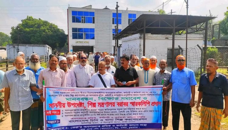 রবিবার বেলা সাড়ে ১১টার দিকে চুয়াডাঙ্গার কেরু এ্যান্ড কোম্পানির জেনারেল অফিসের সামনে কেরু’র অবসরপ্রাপ্ত শ্রমিক ও কর্মচারী কল্যাণ সংস্থার আয়োজনে কেরু’র অবসরপ্রাপ্ত শ্রমিক ও কর্মচারী কল্যাণ সংস্থার সভাপতি হাফিজুর রহমানের সভাপতিত্বে এই মানববন্ধন ও বিক্ষোভ সমাবেশ অনুষ্ঠিত হয়।