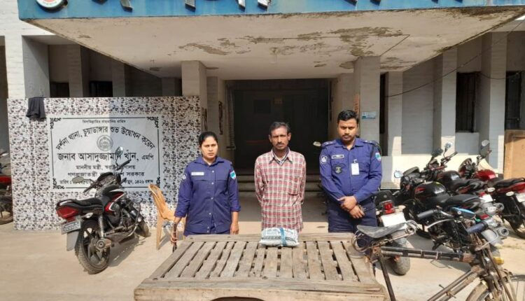 দর্শনা অফিস: দর্শনা থানা পুলিশ মাদক বিরোধী অভিযান চালিয়ে গ্রেফতার করেছে দর্শনা পৌর এলাকার ইশ্বরচন্দ্রপুরের আব্দুর রাজ্জাককে। গতকাল শুক্রবার সকাল সাড়ে ৯টার দিকে দর্শনা থানার অফিসার ইনচার্জ এইচএম লুৎফুল কবীরের নির্দেশে এসআই আহম্মেদ আলী বিশ্বাস ও এএসআই তুহিন হোসেন সঙ্গীয় ফোর্স নিয়ে মাদকবিরোধী অভিযান চালান দর্শনা আকন্দবাড়িয়ায়। পুলিশ ওই এলাকার মুকুলের বাড়ির সামনে পাকা রাস্তার ওপর থেকে গ্রেফতার করে দর্শনা পৌর এলাকার ঈশ্বরচন্দ্রপুরের গোলাম হোসেনের ছেলে আব্দুর রাজ্জাককে (৪০)। এ সময় গ্রেফতারকৃত আব্দুর রাজ্জাকের ব্যবহৃত ভ্যানের নিচে বস্তার মধ্য থেকে ১ কেজি গাঁজা উদ্ধারের তথ্য দিয়েছে পুলিশ। এ ঘটনায় এসআই আহম্মেদ আলী বিশ্বাস বাদী হয়ে আব্দুর রাজ্জাকের বিরুদ্ধে গতকালই দর্শনা থানায় মামলা দায়ের করেছেন।