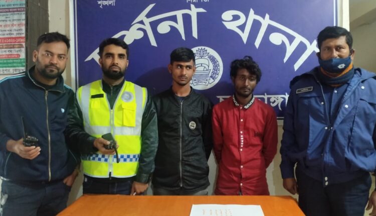 দর্শনা অফিস জানিয়েছে, দর্শনা থানা পুলিশ মাদকবিরোধী অভিযান চালিয়ে ৩৫ পিস ইয়াবাসহ আটক করেছে ঝিনাইদহের নয়ন ও দর্শনার কুরবানকে। গতকাল রোববার ভোর ৫টার দিকে দর্শনা থানার এসআই আহম্মেদ আলী বিশ্বাস, এএসআই মারুফুল ইসলাম ও আবু বক্কর সিদ্দিক গোপন সংবাদের ভিত্তিতে সঙ্গীয় ফোর্স নিয়ে মাদক বিরোধী অভিযান চালান দর্শনা পৌর এলাকার পাঠানপাড়ায়। পুলিশ পাঠানপাড়ার রেল কলোনির তারিকুলের বাড়ির নিকট রাস্তার ওপর থেকে আটক করে ঝিনাইদহ জেলার কোটচাঁদপুর উপজেলার আদর্শপাড়া গ্রামের জাহাঙ্গীর সরকারের ছেলে নয়ন সরকার (২২) ও দর্শনা পৌর এলাকার মোবারকপাড়ার হোসেন আলীর ছেলে কুরবান আলীকে (৪৫)। পুলিশের পক্ষ থেকে বলা হয়েছে, গ্রেফতারকৃত আসামীদ্বয়ের কাছ থেকে ৩৫ পিস ইয়াবা উদ্ধার করা হয়েছে। এ ঘটনায় এসআই আহম্মেদ আলী বিশ্বাস বাদী হয়ে গতকালই দর্শনা থানায় আটককৃত নয়ন সরকার ও কুরবান আলীর বিরুদ্ধে মামলা দায়ের করেছেন।