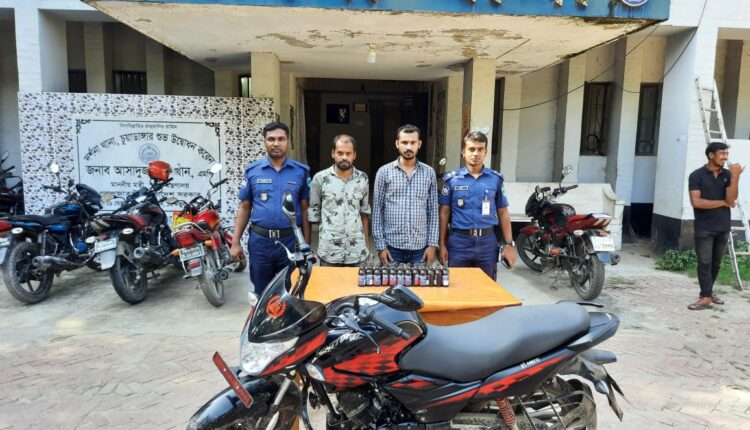 দর্শনা অফিস: দর্শনা থানা পুলিশ মাদকবিরোধী অভিযান চালিয়ে গ্রেফতার করেছে অভিযুক্ত দুই মাদককারবারীকে। উদ্ধার করেছে ফেনসিডিল ও একটি মোটরসাইকেল। তাদের বিরুদ্ধে থানায় দায়ের করা হয়েছে মামলা। গতকাল রোববার দুপুর ১টার দিকে দর্শনা থানার একটি চৌকশ দল গোপন সংবাদের ভিত্তিতে মাদকবিরোধী অভিযান চালান দর্শনা পৌর এলাকার পরানপুরে। পুলিশ পরানপুর বেলে মাঠপাড়ার হাবিবুর রহমান বুলেটের আমবাগানের সামনে একটি ১১০ সিসি হিরো প্যাশন প্লাস মোটরসাইকেলের গতিরোধ করে। এসময় মোটরসাইকেল নিয়ে পলায়নকালে গ্রেফতার করা হয় দর্শনা পৌর এলাকার কলেজপাড়ার জাহাঙ্গীর আলমের ছেলে মুরাদ পারভেজ (৩৫) ও একই পাড়ার আবেদ আলীর ছেলে আরিফ হোসেনকে (২৭)। পুলিশের পক্ষ থেকে বলা হয়েছে, মোটরসাইকেল চালকসহ আরোহীর শরীর ও গাড়িটি তল্লাসি করে ৩৬ বোতল ফেনসিডিল উদ্ধার করা হয়েছে। এ ঘটনায় বাদী হয়ে গতকালই গ্রেফতারকৃত দুজনের বিরুদ্ধে দর্শনা থানায় মামলা দায়ের করেছে পুলিশ।