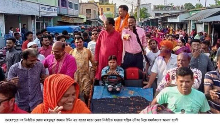 আনন্দ মিছিলের অগ্রভাগে মাহফুজুর রহমান রিটন নৌকার আদলে তৈরি বিশেষ যানে দাঁড়িয়ে মিছিলের নেতৃত্ব দেন। তার দু-পাশে মেহেরপুর জেলা আওয়ামী লীগের সহ-সভাপতি অ্যাড. মিয়াজান আলী ও অ্যাড. ইয়ারুল ইসলাম উপস্থিত ছিলেন। বিশাল বিজয় মিছিলে রঙ মেখে বিভিন্ন শ্রেণিপেশার কয়েক হাজার মানুষ অংশগ্রহণ করেন। বিশেষ করে মেহেরপুর শহরের বিভিন্ন এলাকা থেকে অগত কয়েকশ’ মহিলা বিজয় মিছিলে অংশগ্রহণ করেন।