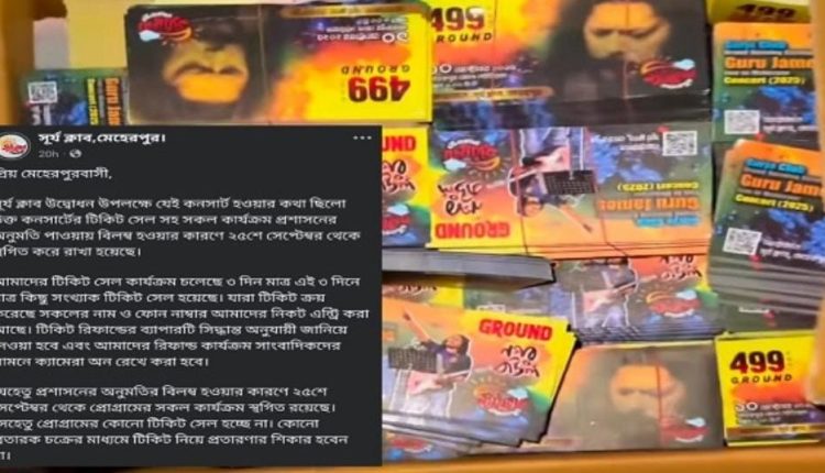 মেহেরপুর অফিস: মেহেরপুর: প্রশাসনের অনুমতি না পাওয়ায় সূর্য ক্লাব মেহেরপুরের উদ্বোধন উপলক্ষে আয়োজিত জনপ্রিয় ব্যান্ড জেমসের কনসার্ট স্থগিত করা হয়েছে।