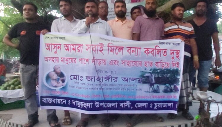 দামুড়হুদা অফিস: ‘দেশ ভাসছে বন্যায়, নিরব থাকা অন্যায় সেøাগানে’ বন্যাকবলিত মানুষের সহয়তায় দামুড়হুদায় পথসভা ও লিফলেট বিতরণ করা হয়েছে। গতকাল রোববার বিকেলে দামুড়হুদা উপজেলা শহরের বাসস্ট্যান্ড এলাকায় দামুড়হুদা উপজেলাবাসীর আয়োজনে ওই পথসভা ও লিফলেট বিতরণ করা হয়। পথসভায় দামুড়হুদা বাসস্ট্যান্ড বাজার কমিটির সভাপতি মাকসুদুর রহমান রতনের সভাপতিত্বে প্রধান অতিথি হিসেবে বক্তব্য রাখেন বিশিষ্ট সমাজ সেবক পশু চিকিৎসক জাহাঙ্গীর আলম। এ সময় বিশেষ অতিথি ছিলেন প্রবীণ রাজনীতিবিদ জান মোহাম্মদ, দামুড়হুদা বাসস্ট্যান্ড বাজার কমিটির সহসভাপতি মুনতাজ আলী, সাধারণ সম্পাদক সাদেক আলী বিশ্বাস পাখী। এ সময় আরও উপস্থিত ছিলেন আব্দুল হাই জনি, ইয়ানবী, আতিয়ার রহমান মিলন, হাফিজ শিকদার ও হাফিজুর রহমান প্রমুখ। পথসভা শেষে অতিথিবৃন্দ বন্যাকবলিত এলাকার মানুষের সহায়তায় সাহায্যর আবেদন সম্বলিত মোবাইল নম্বর বিকাশ (০১৭১৯-০৩৩৬৫৮) উল্লেখ করে লিফলেট বিতরণ করেন। সেই সাথে দলমত নির্বিশেষে বন্যার্তদের সহায়তায় সর্বস্তরের জনগণকে এগিয়ে আসার আহ্বান জানান। পথসভার প্রধান অতিথি পশু চিকিৎসক জাহাঙ্গীর আলম তার বক্তব্যের পর বন্যাকবলিত মানুষের সহায়তায় নগদ ১০ হাজার টাকা ফান্ডে জমা দেন এবং পরবর্তীতে আরও আর্থিক সহায়তা প্রদানের আশ্বাস দেন। আজ সোমবার থেকে বন্যাকবলিত মানুষের সহয়তায় দামুড়হুদা উপজেলাবাসীর উদ্যোগে গঠনকৃত এই ফান্ডে রসিদের মাধ্যমে আর্থিক সহায়তা প্রদানের আহ্বান জানানো হয়।
