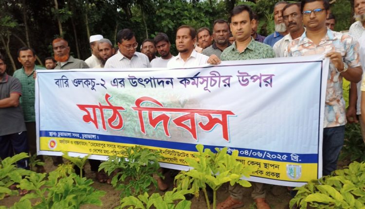চুয়াডাঙ্গায় বারি ওলকচু-২ ও বারি মুগ-৬ জাতের উৎপাদন কর্মসূচির ওপর মাঠ দিবস অনুষ্ঠিত হয়েছে। গতকাল বুধবার বিকেলে পৌর এলাকার বুজরুকগড়গড়ী বনানীপাড়া ঈদগাহ ময়দানে এ মাঠ দিবসটি অনুষ্ঠিত হয়। বাংলাদেশ কৃষি গবেষণা ইনস্টিটিউটের উদ্যোগে উপ-প্রকল্প পরিচালক (ডিপিডি) ড. জাহান আল মাহমুদের সভাপতিত্বে অনুষ্ঠিত মাঠ দিবসে জেলা বীজ প্রত্যয়ন অফিসার নুরুল ইসলাম প্রধান অতিথি হিসেবে বক্তব্য রাখেন। মাঠ দিবসে কুষ্টিয়া মৃত্তিকা গবেষণা কেন্দ্রের উর্দ্ধতন বৈজ্ঞানিক কর্মকর্তা শফিকুল মওলা বিশেষ অতিথি হিসেবে বক্তব্য রাখেন। কুষ্টিয়া সগবি এএস্ও মো. মামুন হুসাইনের সঞ্চালনায় মাঠ দিবসে কুষ্টিয়া সগবি এস,ও মো. রাসেল কবীর তরফদার বক্তব্য রাখেন।