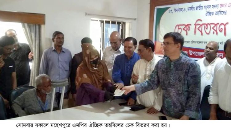 মহেশপুর প্রতিনিধি: ঝিনাইদহের মহেশপুরে গরিব, দুস্থ ও অসহায় ব্যক্তিদের মাঝে এমপির ঐচ্ছিক তহবিলের চেক বিতরণ করা হয়। গতকাল সোমবার বেলা ১১টায় চেক বিতরণ উপলক্ষ্যে উপজেলা পরিষদ সম্মেলন কক্ষে এক অনুষ্ঠানের আয়োজন করা হয়। উপজেলা নির্বাহী অফিসার নয়ন কুমার রাজবংশীর সভাপতিত্বে প্রধান অতিথির বক্তব্য রাখেন এমপি শফিকুল আজম খাঁন চঞ্চল। বিশেষ অতিথির বক্তব্য রাখেন উপজেলা চেয়ারম্যান ময়জদ্দীন হামীদ, উপজেলা ভাইস চেয়ারম্যান আজিজুল হক আজা, মহিলা ভাইস চেয়ারম্যান হাসিনা খাতুন হেনা, মহেশপুর থানার অফিসার ইনচার্জ খন্দকার শামীম উদ্দিন। এছাড়াও উপস্থিত ছিলেন ইউপি চেয়ারম্যান গোলাম হায়দার লান্টু, সালাউদ্দিন, সামছুল আলম মৃধা, নাজমুল হুদা জিন্টু, মিজানুর রহমান, জামিরুল হক প্রমুখ। উক্ত অনুষ্ঠানে উপজেলার বিভিন্ন এলাকার গরিব, দুস্থ ও অসহায় ৬৯ জনের মাঝে ২ লাখ ৭১ হাজার টাকার চেক বিতরণ করা হয়।