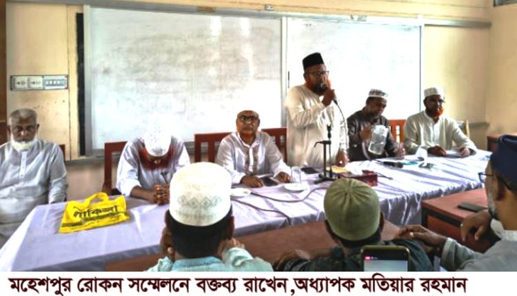 মহেশপুর প্রতিনিধি: ঝিনাইদহের মহেশপুর উপজেলা জামায়াতের রোকন সম্মেলন অনুষ্ঠিত হয়েছে। গতকাল শনিবার সকালে মহেশপুর আল-হেরা দাখিল মাদরাসার হলরুমে উপজেলা জামায়াতের আমির ফারুক আহমেদের সভাপতিত্বে অনুষ্ঠানে প্রধান অতিথি হিসাবে বক্তব্য রাখেন ঝিনাইদহ-৩ আসনের জামায়াতের মনোনীত প্রার্থী কেন্দ্রীয় সূরা সদস্য অধ্যাপক মতিয়ার রহমান। বিশেষ অতিথি হিসাবে বক্তব্য রাখেন, জামায়াতের জেলা সহকারী সাধারণ সম্পাদক আব্দুল হাই, উপজেলা নায়েবে আমির আবদুল বারী,ফকির আহমেদ,আব্দুল আলী,থানা সেক্রিটারি ইসমাইল হোসেন পলাশ, উপজেলা অফিস সেক্রেটারি লুৎফর রহমান প্রমুখ। অনুষ্ঠানে আরও উপস্থিত ছিলেন কর্ম পরিষদের সদস্যবৃন্ধরা। সম্মেলনে উপজেলার নারী পুরুষ উভয় রোকন সদস্যরা অংশগ্রহণ করে। প্রধান অতিথি তার বক্তেব্যে বলেন, আগামী জাতীয় সংসদ নির্বাচন হবে হক আর বাতিলে লড়াই। তিনি সকলকে ঐক্যবদ্ধ ভাবে সর্বশক্তি নিয়োগ করে নির্বাচনে ঝাপিয়ে পড়ার আহবান জানান এবং জামায়াতের প্রার্থীকে বিজয় করা অঙ্গীকার ব্যাক্ত করেন।