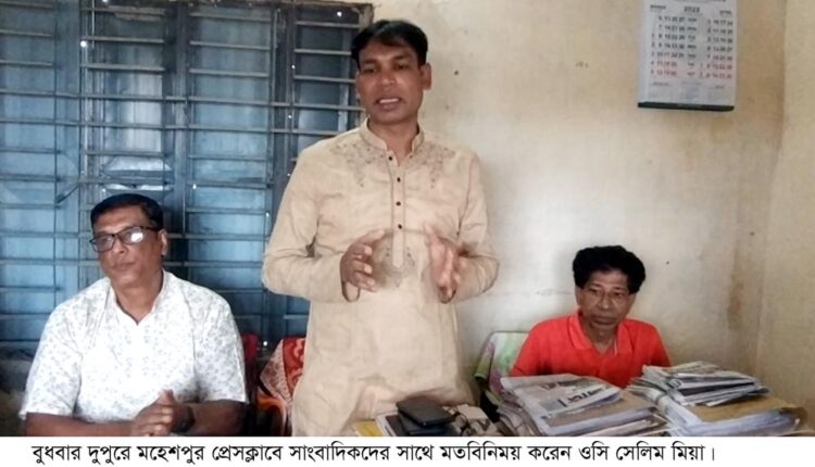 মহেশপুর প্রতিনিধি: ঝিনাইদহের মহেশপুর থানার অফিসার ইনচার্জ (ওসি) সেলিম মিয়ার সাথে মহেশপুর প্রেসক্লাব নেতৃবৃৃন্দের সৌজন্য সাক্ষাৎ ও মতবিনিময় অনুষ্ঠিত হয়। বুধবার দুপুরে মহেশপুর প্রেসক্লাবে সৌজন্য সাক্ষাৎকালে উপস্থিত ছিলেন ওসি সেলিম মিয়া, মহেশপুর প্রেসক্লাব সভাপতি আব্দুর রহমান, সাধারণ সম্পাদক শেখ এনামুল হক দুলু, যুগ্ম সম্পাদক সাইফুল ইসলাম, দপ্তর সম্পাদক দাউদ হোসেন, প্রকাশনা সম্পাদক আনওয়ারুল ইসলাম, সাংস্কৃতিক ও ক্রীড়া সম্পাদক শামীম খাঁন জনি, নির্বাহী সদস্য আলমগীর হোসেন, দৈনিক প্রতিদিনের সংবাদ পত্রিকার প্রতিনিধি পলাশ রহমান।