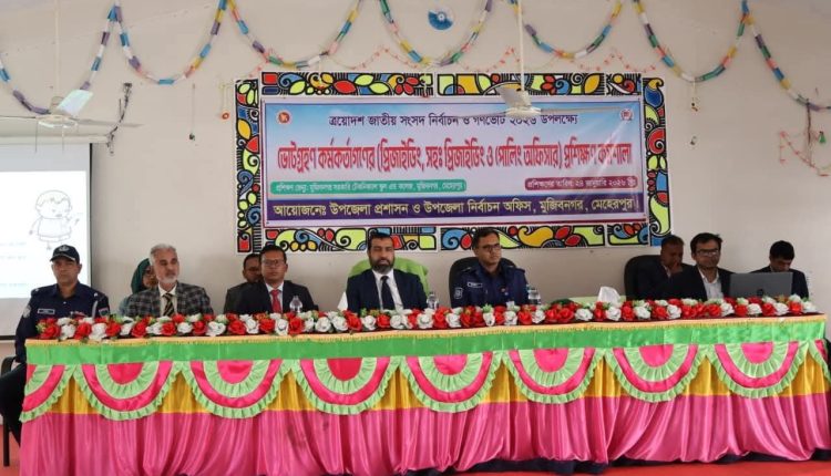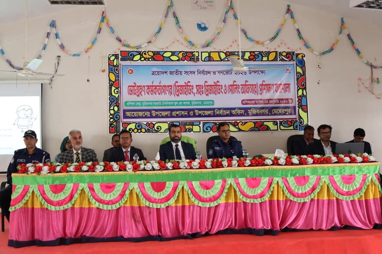মুজিবনগর প্রতিনিধি:মুজিবনগর টেকনিক্যাল স্কুল এন্ড কলেজ হল রুমে আজ ২৪ জানুয়ারি ২০২৬ তারিখে আসন্ন ত্রয়োদশ জাতীয় সংসদ নির্বাচন ও গণভোট–২০২৬ উপলক্ষে প্রিজাইডিং অফিসার, সহকারী প্রিজাইডিং অফিসার এবং পোলিং অফিসারদের অংশগ্রহণে এক দিনব্যাপী প্রশিক্ষণ কর্মসূচি অনুষ্ঠিত হয়েছে।