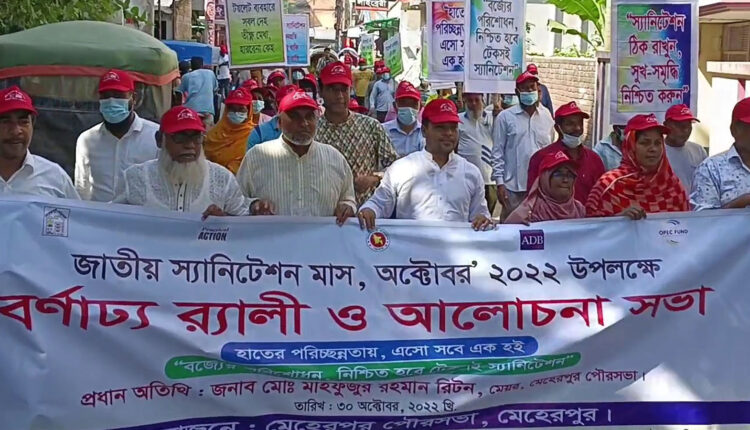 মেহেরপুর অফিস: মেহেরপুর পৌরসভার আয়োজনে জাতীয় স্যানিটেশন মাস উপলক্ষে বর্ণাঢ্য শোভাযাত্রা ও আলোচনা সভা অনুষ্ঠিত হয়েছে। গতকাল রোববার সকাল সাড়ে ১০টায় মেহেরপুর পৌর মেয়র মাহফুজুর রহমান রিটনের নেতৃত্বে এ উপলক্ষে একটি বর্ণাঢ্য শোভাযাত্রা বের করা হয়। শোভাযাত্রাটি মেহেরপুর পৌরসভা থেকে শুরু করে শহরের প্রধান প্রধান সড়ক প্রদক্ষিণ শেষে একইস্থানে গিয়ে শেষ হয়। শোভাযাত্রায় অন্যান্যের মধ্যে মেহেরপুর পৌরসভার প্যানেল মেয়র শাহিনুর রহমান, কাউন্সিলর নুরুল ইসলাম রাজিব, আল মামুন, মীর জাহাঙ্গীর, মোস্তাক আহমেদ, আব্দুর রহিমসহ মেহেরপুর পৌরসভার কর্মকর্তাগণ ও বিভিন্ন শ্রেণি-পেশার মানুষ অংশগ্রহণ করেন। পরে মেহেরপুর পৌরসভা কার্যালয় চত্বরে আলোচনাসভা অনুষ্ঠিত হয়।