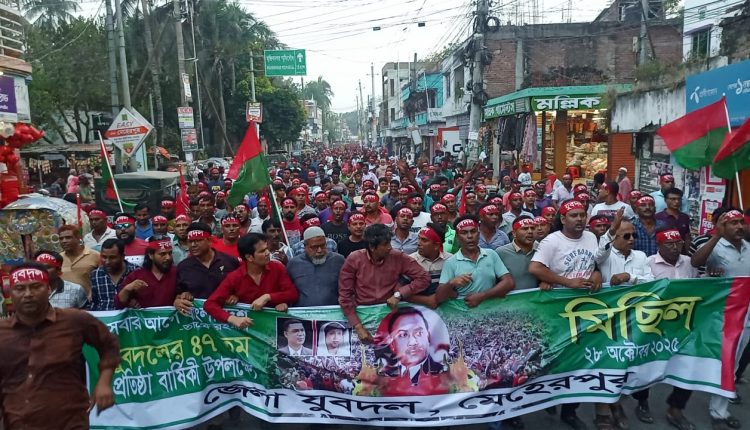 মেহেরপুর প্রতিনিধি:যুবদলের ৪৭ তম প্রতিষ্ঠা বার্ষিকী উপলক্ষে মেহেরপুরে মিছিল ও সমাবেশ করেছে জেলা যুবদল। মঙ্গলবার বিকালে সড়ক বিভাগের সামনে থেকে জেলা যুবদলের সভাপতি জাহিদুল হক জাহিদের নেতৃত্বে একটি মিছিল বের হয়ে শহরের প্রধান প্রধান সড়ক প্রদক্ষিণ করে কাথুলি বাস স্ট্যান্ডে গিয়ে শেষ হয়। এর আগে সেখানে সমাবেশ করা হয়। সাবেক ছাত্রনেতা আহমেদ রাজিব খানের পরিচালনায় সভাপতিত্ব করেন মেহেরপুর জেলা যুবদলের সভাপতি জাইদুল হক জাহিদ। এ সময় সমাবেশে প্রধান অতিথি হিসেবে বক্তব্য রাখেন পৌর বিএনপি’র সাবেক সভাপতি জাহাঙ্গীর বিশ্বাস, পৌর যুবদলের আহবায়ক ছামিউল ইসলাম লিজন, সদস্য সচিব নওশেদ আহমেদ রনি, কুতুবপুর ইউনিয়ন যুবদলের সভাপতি শামীম হোসেন, সদর উপজেলা যুবদলের সদস্য সচিব কামরুজ্জামান বিপ্লব প্রমূখ। এ সময় উপস্থিত ছিলেন জেলা যুবদলের সহসভাপতি বাবু সাবের, যুগ্ম সহ-সাধারণ সম্পাদক সাইদুর সুজন, মুজিবনগর উপজেলা যুবদলের আহ্বায়ক আবুল হাসান, যুগ্ম আহবায়ক খোরশেদ আলম, জেলা যুবদলের সিনিয়র যুগ্ম সম্পাদক মেহেদী হাসান রোকন, স্বাস্থ্য বিষয়ক সম্পাদক ইসমাইল হোসেন সহ জেলা যুবদলের নেতৃবৃন্দ।