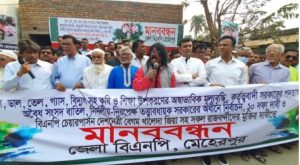 মেহেরপুর অফিস জানিয়েছে, মেহেরপুর জেলা বিএনপির আয়োজনে গতকাল শনিবার সকাল সাড়ে ১০টায় আয়োজিত চাল, ডাল, তেল, বিদ্যুৎ, কৃষি উপকরণ ও শিক্ষা উপকরণসহ নিত্য প্রয়োজনীয় দ্রব্যের মূল্য বৃদ্ধির প্রতিবাদে ১০ দফা দাবি ও বিএনপি চেয়ারপারসন বেগম খালেদা জিয়ার মুক্তির দাবিতে মানববন্ধন কর্মসূচি পালিত হয়েছে। অনুষ্ঠানে প্রধান অতিথি ছিলেন বিএনপির তথ্য ও গবেষণা বিষয়ক সহ-সম্পাদক আমিরুজ্জামান শিমুল।