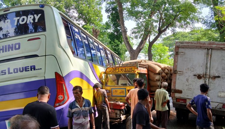 আলমডাঙ্গা ব্যুরো: আলমডাঙ্গা পৌর বাসটার্মিনাল অদূরবর্তি অবৈধ লাটাহাম্বারের ধাক্কায় প্রাইভেটকার ও সোনারতরি পরিবহন দুমড়ে মুছড়ে গেছে। গতকাল সোমবার সকাল ৯টার দিকে পৌর বাসটার্মিনাল ও উত্তরা ফিলিং ষ্টেশনের মাঝামাঝি এ দূর্ঘটনা ঘটে। স্থানীয়রা জানান, চুয়াডাঙ্গার দিক থেকে সোনারতরি পরিবহণ কুষ্টিয়া আসছিলো। বাসটি ঘটনাস্থলে পৌছালে কুষ্টিয়ার দিক থেকে চুয়াডাঙ্গার দিকে যাওয়া প্রাইভেটকার বাসটিকে সাইড দেয়। এ সময় পিছন থেকে একটি ভুট্টা বোঝাই অবৈধ লাটাহাম্বার স্বজোড়ে প্রাইভেটকারের ধাক্কা মারে। প্রাইভেটকারটি গিয়ে সামনের একটি গাছের সাথে মেরে দেয়। এরপর ভুট্টা বোঝাই অবৈধ লাটাহাম্বার সোনারতরি পরিবহনের ডান সাউডে ধাক্কা মারলে বাসটির ডান সাইড দুমড়ে মুছড়ে যায়। প্রায় ২ ঘন্টা পর সড়কে যানবাহন চলাচল স্বাভাবিক হয়। পরে আলমডাঙ্গা থানা পুলিশ ঘটনাস্থলে উপস্থিত হয়ে গাড়ি উদ্ধার করে। এ ঘটনায় কেউ গুরুত্বর জখম হয়নি।