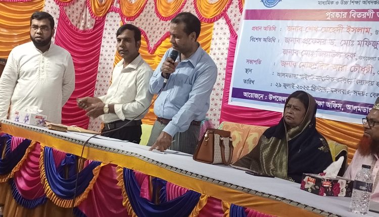 রহমান মুকুল: যেন অগণন দীপ্ত তারার নীচে আলোর উৎসব বসেছিল আলমডাঙ্গায়। এ যেন জ্যোৎস্নাঘেরা এক সকালের মুখোমুখি দাঁড়িয়ে বলে উঠছে –“আমরাও হার মানি এই হাসিমুখের দীপ্তিতে।” চাঁদের হাট নয়-এ ছিল চিত্তের উৎসব, প্রতিভার সম্মিলন। শিক্ষার্থীরা একত্রিত হয়েছিলেন সম্মান আর স্নেহের আলিঙ্গণে। হাসিমাখা মুখ, বুকভরা অর্জন আর চোখজোড়া স্বপ্ন আর আকাশ ছোঁয়া প্রত্যয় নিয়ে উপজেলার কৃতি শিক্ষার্থীরা মিলিত হয়েছিল এ অনন্য আয়োজনে। মঞ্চজুড়ে ছিল উৎসবের নীরব স্পন্দন। শুধু করতালি নয়, প্রতিটি মুহূর্তে উচ্চারিত হচ্ছিল একটি প্রজন্মের অদম্য অভিযাত্রার অশ্রুত বিহগল। মাধ্যমিক ও উচ্চশিক্ষা অধিদপ্তরের পারফরমেন্স বেজড গ্র্যান্টস ফর সেকেন্ডারি ইন্সটিটিউশনস স্কিম (ঝঊউচও)-র আওতায় আলমডাঙ্গা উপজেলার ১৪টি শিক্ষা প্রতিষ্ঠান থেকে নির্বাচিত ৩৪ জন কৃতি শিক্ষার্থীকে সম্মাননা প্রদান করা হয়। গতকাল মঙ্গলবার বেলা ১১টায় আলমডাঙ্গা পাইলট মাধ্যমিক বালিকা বিদ্যালয়ের মিলনায়তনে। যার প্রতিটি দেয়ালে যেন অনুরণিত হচ্ছিল তরুণ চোখে জ্বলে থাকা আগামীর সম্ভাবনা। অনুষ্ঠানের সভাপতিত্ব করেন চুয়াডাঙ্গা জেলা মাধ্যমিক শিক্ষা অফিসার দিল আরা চৌধুরী। প্রধান অতিথি ছিলেন ভারপ্রাপ্ত উপজেলা নির্বাহী অফিসার ও সহকর্মী কমিশনার (ভূমি) আশীষ কুমার বসু। বিশেষ অতিথি হিসেবে বক্তব্য রাখেন আলমডাঙ্গা সরকারি কলেজের অধ্যক্ষ প্রফেসর ড. মো. মফিজুর রহমান, উপজেলা মাধ্যমিক শিক্ষা অফিসার জিয়াউল হক, জেলা সহকারী শিক্ষা পরিদর্শক মুস্তাকিন বিল্লাহ, পৌর বিএনপির সাধারণ সম্পাদক জিল্লুর রহমান ওল্টু, পাইলট উচ্চ বিদ্যালয়ের ভারপ্রাপ্ত প্রধান শিক্ষক ইলিয়াছ হোসেন।