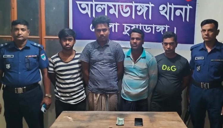 জানা গেছে, পৌর এলাকার গোবিন্দপুর মাঠপাড়ার সাইফুল ইসলামের বাড়ির পেছনে ফাঁকা মাঠে কয়েকজন যুবক মোবাইল ফোনে টাকার বিনিময়ে লুডু গেমের মাধ্যমে জুয়া খেলা করছে। এমন সংবাদ পেয়ে আলমডাঙ্গা থানার এসআই আশিকুল হক, এসআই দেবাশিষ মহলদার ও এএসআই জালাল উদ্দিন সঙ্গীয় ফোর্স নিয়ে অভিযান চালায়। পুলিশ মোবাইল ফোনে টাকা দিয়ে লুডু গেমের মাধ্যমে জুয়া খেলা অবস্থায় গোবিন্দপুর মাঠপাড়ার মৃত সাহাজ উদ্দীনের ছেলে শহিদুল ইসলাম (৩০), একই পাড়ার শহিদুল ইসলামের ছেলে আলমগীর হোসেন (৩২), সোহেল আলীর ছেলে রিংকু আলী (১৮) ও হেলাল উদ্দিনের ছেলে কিশোর মোহাম্মদ নাঈমকে (১৫) আটক করে। আটকের পর তাদের নিকট থেকে নগদ ২ হাজার ৭শ ৫০ টাকা ও জুয়া খেলায় ব্যবহৃত একটি মোবাইলফোন উদ্ধার করা হয়। এ বিষয়ে আলমডাঙ্গা থানায় মামলা দায়ের করা হয়েছে। গতকালই তাদেরকে আদালতে সোপর্দ করা হয়েছে।
