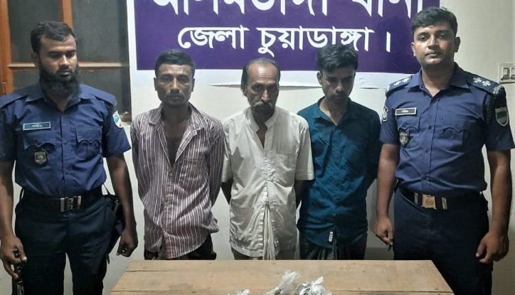 জানা গেছে, কুষ্টিয়ার মিরপুর উপজেলার মালিহাদ গ্রামের মৃধাপাড়ার মৃত মুনছুর প্রামানিকের ছেলে বাবুল ফকির ওরফে বাবলু (৫৮), ঝিনাইদহর কালীগঞ্জ উপজেলার দামোদরপুর গ্রামের আব্দুর রহিমের ছেলে কাজল (৩৫) ও আলমডাঙ্গা উপজেলার নারানপুর গ্রামের মৃত আবু বক্কর সিদ্দীকের ছেলে চুন্নু আলী (৪৫) দীর্ঘদিন ধরে মাদক বিক্রি ও সেবন করে আসছেন। তারা মিরপুর উপজেলা থেকে কৌশলে গাঁজা কিনে নিয়ে বিভিন্ন এলাকায় বিক্রি করেন। রোববার রাতে ওসমানপুর ক্যাম্প পুলিশ গোপন সংবাদের ভিত্তিতে এসআই খসরু আলম সঙ্গীয় ফোর্স নিয়ে প্রাগপুর গ্রামের জেহের আলীর চায়ের দোকানের সামনে উপস্থিত হন। এসময় মাদককারবারিরা পুলিশের উপস্থিতি টের পেয়ে পালানোর চেষ্টাকালে তাদের আটক করা হয়। আটকের পর তাদেরকে তল্লাশি করে ৩শ গ্রাম গাঁজা উদ্ধার করা হয়েছে। এ বিষয়ে আলমডাঙ্গা থানায় মাদকদ্রব্য নিয়ন্ত্রন আইনে মামলা দায়ের করা হয়েছে।