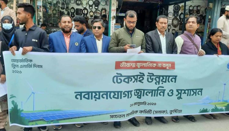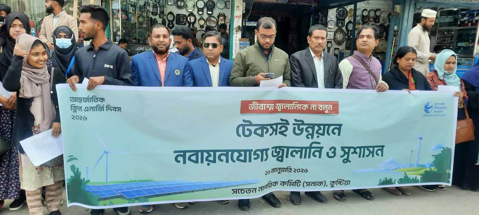 কুষ্টিয়া প্রতিনিধি:কুষ্টিয়ায় টেকসই উন্নয়নে নবায়নযোগ্য জ্বালানি ও সুশাসন বিষয়ে মানববন্ধন অনুষ্ঠিত হয়েছে। সোমবার সকালে শহরের পাঁচ রাস্তা মোড়ে সচেতন নাগরিক কমিটির উদ্যোগে নবায়নযোগ্য জ্বালানি উৎপাদন ও ব্যবহার বৃদ্ধি সম্পর্কে সচেতনতামূলক ক্যাম্পেইনের অংশ হিসেবে আন্তর্জাতিক ক্লিন এনার্জি দিবস উপলক্ষে এ মানববন্ধন অনুষ্ঠিত হয়। এ সময়ে সচেতন নাগরিক কমিটির সদস্য সুভাশীষ সাহা খোকন, ট্রান্সপারেন্সি ইন্টারন্যাশনাল বাংলাদেশ (টিআইবি)’র এরিয়া কো-অর্ডিনেটর রায়হানুল ইসলাম, মিরপুর প্রেসক্লাবের সাধারণ সম্পাদক রাশেদুজ্জামান রিমন, সেতু এনজিও’র প্রশাসনিক কর্মকর্তা মিজানুর রহমান, এফপিএবির জেলা কর্মকর্তা কাওসার আলী সৈকত, মুক্তি নারী ও শিশু উন্নয়ন সংস্থার প্রকল্প কর্মকর্তা সাবেরা সুলতানা প্রমুখ উপস্থিত ছিলেন। মানববন্ধনে বক্তারা বলেন, জলবায়ু পরিবর্তন মোকাবেলায় এবং টেকসই উন্নয়ন অভিষ্ট অর্জনে পরিচ্ছন্ন জ্বালানি অপরিহার্য। নবায়নযোগ্য জ্বালানি পরিবেশবান্ধব এবং টেকসই উন্নয়নের মূল চাবিকাঠি। নবায়নযোগ্য জ্বালানি উৎপাদন ও ব্যবহার বৃদ্ধিতে জনকল্যাণ নিশ্চিত হবে বলে বক্তারা জানান।