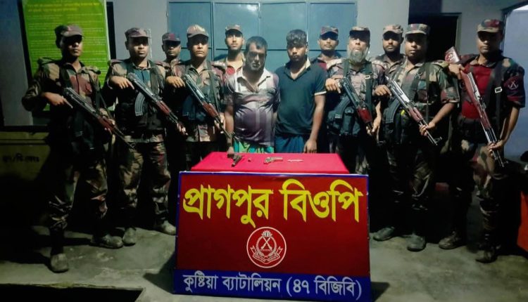 কুষ্টিয়া প্রতিনিধি: কুষ্টিয়ার দৌলতপুর সীমান্ত এলাকায় পৃথক দুটি অভিযানে অস্ত্র ও গুলিসহ দুজনকে আটক করেছে বর্ডার গার্ড বাংলাদেশ (বিজিবি)। এ সময় একটি বিদেশি পিস্তল, একটি শটগান, একটি ম্যাগাজিন এবং তিন রাউন্ড গুলি উদ্ধার করা হয়েছে। গতকাল বুধবার সকাল ১০টার দিকে কুষ্টিয়া ৪৭ বিজিবির পাঠানো এক সংবাদ বিজ্ঞপ্তিতে এসব তথ্য জানানো হয়। বিজিবি জানায়, মঙ্গলবার রাতে দৌলতপুর উপজেলার ঠোটারপাড়া বিওপির আওতাধীন পাকুড়িয়া দক্ষিণপাড়া গ্রামে প্রথম অভিযান চালানো হয়। এ সময় মৃত রহমত সর্দারের ছেলে মঞ্জিল সর্দারকে (৪৩) আটক করা হয়। তার বাড়ির উঠোনে গোয়ালঘরে তল্লাশি চালিয়ে একটি শটগান ও একটি গুলি উদ্ধার করা হয়। পরে মঞ্জিল সর্দারের স্বীকারোক্তির ভিত্তিতে দ্বিতীয় দফা অভিযান চালানো হয় জয়পুর বিওপির আওতাধীন এলাকায়। অভিযানে মঞ্জিলের ভাতিজা শফিকুল সর্দারের ছেলে টুটুল সর্দারের (২৫) বাড়ি তল্লাশি করে একটি চালের ড্রামের ভেতর থেকে একটি বিদেশি পিস্তল, একটি ম্যাগাজিন এবং দুই রাউন্ড গুলি উদ্ধার করা হয়। জিজ্ঞাসাবাদে মঞ্জিল সর্দার স্বীকার করেন, দু-দিন আগে তারা ভারতীয় সীমান্ত এলাকার এক ব্যক্তির কাছ থেকে এসব অস্ত্র সংগ্রহ করেছেন। উদ্ধারকৃত অস্ত্র ও গুলির আনুমানিক বাজারমূল্য এক লাখ ১৬ হাজার ৬০০ টাকা। এ বিষয়ে ৪৭ বিজিবির অধিনায়ক লেফটেন্যান্ট কর্নেল মাহাবুব মুর্শেদ জানান, আটকদের বিরুদ্ধে প্রয়োজনীয় আইনানুগ ব্যবস্থা গ্রহণ করা হবে এবং তাদের দৌলতপুর থানায় হস্তান্তর করা হয়েছে। এ ছাড়া সীমান্তে অবৈধ অস্ত্র চোরাচালান রোধে গোয়েন্দা নজরদারি আরও জোরদার করা হয়েছে।