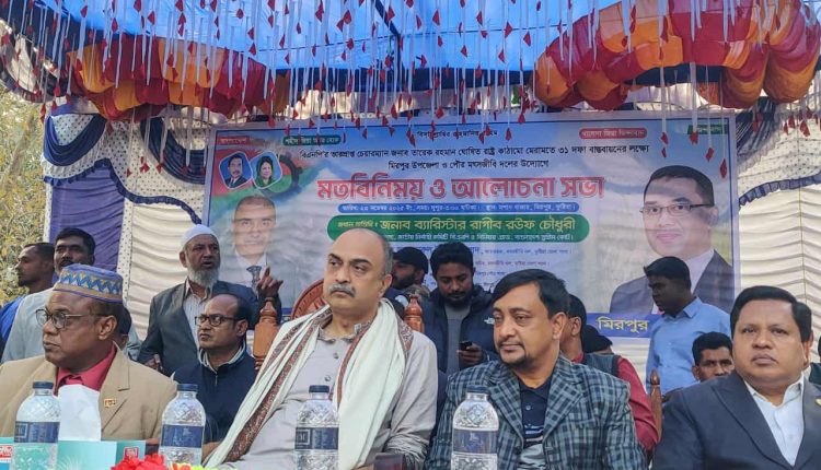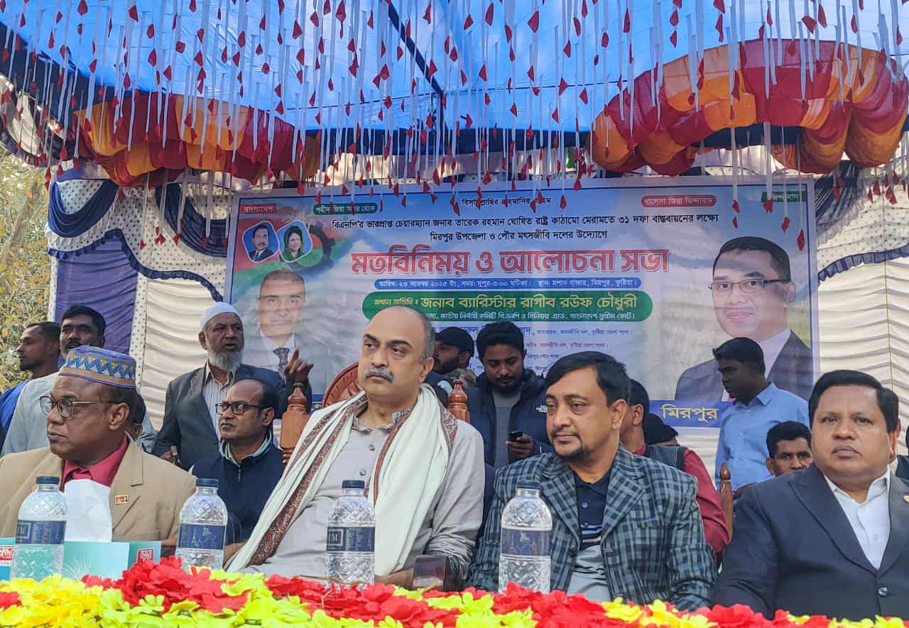 কুষ্টিয়া প্রতিনিধি:কুষ্টিয়ার মিরপুরে বিএনপির ভারপ্রাপ্ত চেয়ারম্যান তারেক রহমান ঘোষিত রাষ্ট্র কাঠামো মেরামতে ৩১ দফা বাস্তবের লক্ষ্যে মতবিনিময় ও আলোচনা সভা অনুষ্ঠিত হয়। জেলার মিরপুর উপজেলা ও পৌর মৎস্যজীবী দলের উদ্যোগে রোববার বিকেলে মশান বাজারে এ আলোচনা সভা অনুষ্ঠিত হয়। অনুষ্ঠানে প্রধান অতিথির বক্তব্যে বিএনপির জাতীয় নির্বাহী কমিটির সদস্য কুষ্টিয়া-২ (মিরপুর-ভেড়ামার) আসনে বিএনপির মনোনীত সংসদ সদস্য পদপ্রার্থী ব্যারিস্টার রাগীব রউফ চৌধুরী বলেন,