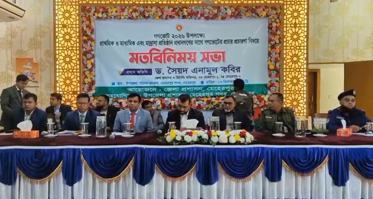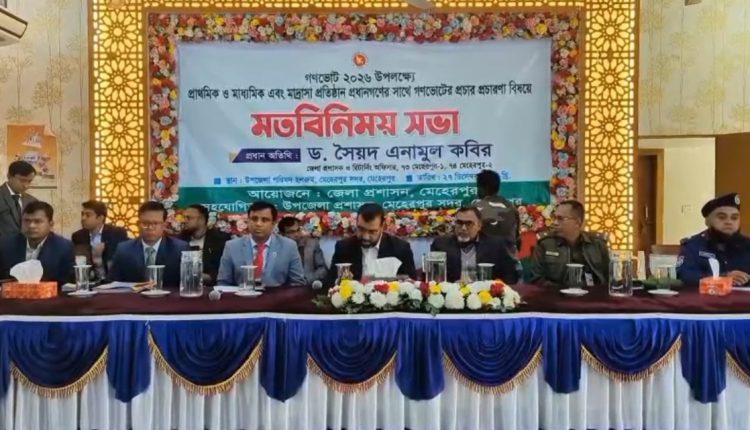 মেহেরপুর প্রতিনিধি:আগামী গণভোট ২০২৬ সফলভাবে বাস্তবায়নের লক্ষ্যে প্রাথমিক, মাধ্যমিক ও মাদ্রাসা শিক্ষা প্রতিষ্ঠানের প্রধানগণের সঙ্গে গণভোটের প্রচার ও জনসচেতনতা বিষয়ে এক মতবিনিময় সভা অনুষ্ঠিত হয়েছে।