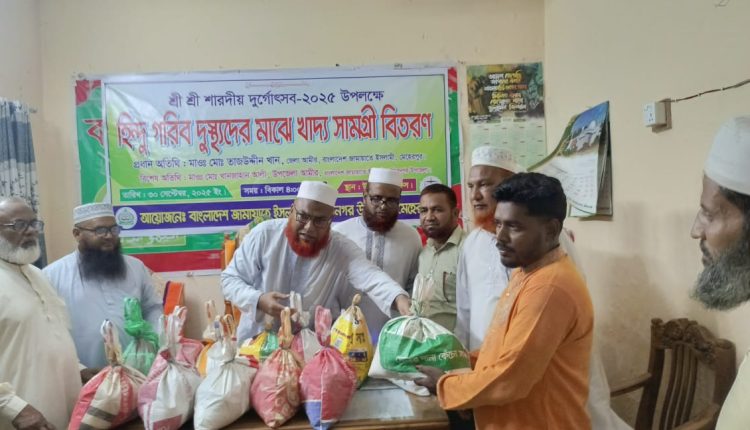 মেহেরপুর অফিস:মেহেরপুর জেলার মুজিবনগর উপজেলার উদ্যোগে বাংলাদেশ জামায়াতে ইসলামী’র পক্ষ থেকে গরিব ও অসহায় হিন্দু সম্প্রদায়ের মাঝে খাদ্য সামগ্রী বিতরণ করা হয়েছে। মানবিক এই কার্যক্রমে শতাধিক পরিবারের হাতে চাল, ডাল, তেল, লবণসহ নিত্যপ্রয়োজনীয় সামগ্রী তুলে দেওয়া হয়।