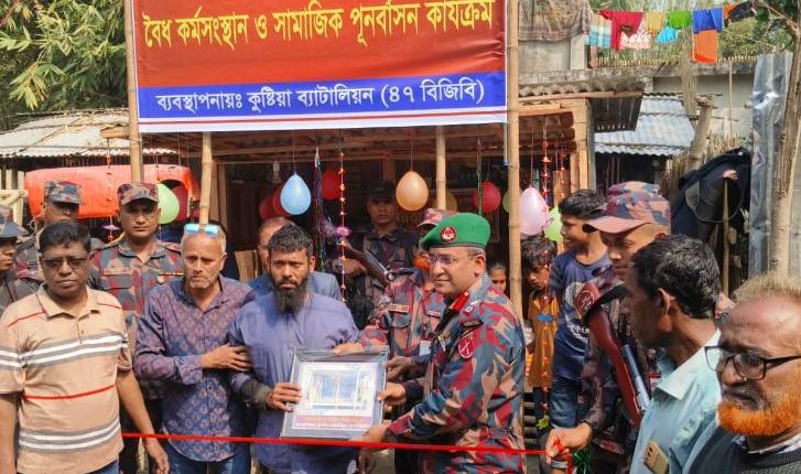 গাংনী প্রতিনিধি: অন্ধকার থেকে আলোর পথে ফিরে আসায় মেহেরপুরের সীমান্তবর্তী কাজীপুর গ্রামের খোকন নামের এক প্রতিবন্ধীকে পুনর্বাসন করেছে বিজিবি। গতকাল শনিবার দুপুরে বিজিবি ৪৭ ব্যাটালিয়নের অধিনায়ক লেফটেন্যান্ট কর্নেল মাহবুব মুর্শেদ আনুষ্ঠানিকভাবে এ দোকান হস্তান্তর করেন। ৪৭ বর্ডার গার্ড ব্যাটালিয়নের (বিজিবি) বৈধ কর্মসংস্থান ও সামাজিক পুনর্বাসন কার্যক্রমের অংশ হিসেবে এ দোকান উপহার দেয়া হয়েছে। দোকান উপহার প্রাপ্ত খোকন মেহেরপুর গাংনীর কাজিপুর গ্রামের খন্দকার পাড়ার খন্দকার হিয়ার আলীর ছেলে। বিজিবি ৪৭ ব্যাটালিয়নের অধিনায়ক লেফটেন্যান্ট কর্নেল মাহবুব মুর্শেদ জানান, খোকন এক সময় কসাইয়ের কাজ করতেন। কয়েক বছর আগে প্যারালাইজ্ড হয়ে পড়েন। আর্থিক অনটনের কারণে প্যারালাইজ্ড অবস্থায় সে মাদক পাচারে জড়িয়ে পড়ে। গ্রেফতার হয় বিজিবির হাতে। অসহায় পরিবারের কথা ভেবে স্থানীয়রা বিজিবির কাছে স্বাভাবিক জীবনে ফিরে আসার মুচলেকা দিলে ছেড়ে দেয়া হয়। এরপর থেকে স্বাভাবিক জীবন যাপন শুরু করে খোকন। বিষয়টি অতি মানবিক বিবেচনায় বিজিবি খোকনকে পুনর্বাসনের আশ্বাস দেন এবং আলোর পথে ফিরে আসায় খোকনের কর্মসংস্থানের ব্যবস্থা করার প্রত্যয় ব্যক্ত করেন। সে অনুযায়ী শনিবার সকালে আনুষ্ঠানিকভাবে দোকানঘর হস্তান্তর করা হয়। যারা অন্ধকার জগত থেকে আলোর পথে ফিরবেন তাদের জন্য বিজিবি পুনর্বাসনের চেষ্টা অব্যাহত রাখবে বলেও জানান এই অধিনায়ক। এ সময় কাজিপুর ইউপি চেয়ারম্যান আলম হুসাইন, ইউপি মেম্বার শাহিনসহ এলাকার সুধিজন উপস্থিত ছিলেন।