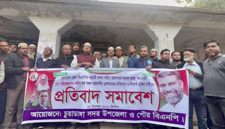 চুয়াডাঙ্গায় সদর উপজেলা ও পৌর বিএনপির উদ্যোগে গতকাল রোববার বিকেলে চুয়াডাঙ্গা সাহিত্য পরিষদ চত্বরে এ সমাবেশ অনুষ্ঠিত হয়। সদর উপজেলা বিএনপির সভাপতি নজরুল ইসলামের সভাপতিত্বে অনুষ্ঠিত প্রতিবাদ সভায় প্রধান অতিথির বক্তব্য দেন জেলা বিএনপির আহ্বায়ক কমিটির সদস্য খোন্দকার আব্দুল জব্বার। খোন্দকার আব্দুল জব্বার তার বক্তব্যে বলেন, চুয়াডাঙ্গায় গত শনিবারের গণমিছিল কর্মসূচি ছিলো শান্তিপূর্ণ। প্রেসক্লাবের পাশে নেতারা বসে ছিলেন, কর্মীরা আসছিলেন। হঠাৎ বিনা উসকানিতে শরীফুজ্জামান শরীফকে পাঞ্জাবির কলার চেপে ধরে যেভাবে পুলিশের গাড়িতে তুলে নেয়া হয়েছে, তা ন্যক্কারজনক। অতি উৎসাহী দু-একজন পুলিশ কর্মকর্তার কারণে গোটা পুলিশ বাহিনী আজ বিতর্কিত হচ্ছে। খোন্দকার আব্দুল জব্বার আরও বলেন, এ দেশের মানুষের ভাগ্য পরিবর্তনে, ভাত ও ভোটের অধিকার আদায় করার লক্ষ্যে বিএনপি রাজপথে রয়েছে। আগামী দিনে আন্দোলনের মধ্য দিয়ে ফ্যাসিবাদী এই সরকারকে উৎখাত করে জনগণের সরকার প্রতিষ্ঠা করা হবে। জেলা বিএনপির আহ্বায়ক কমিটির সদস্য মীর্জা ফরিদুল ইসলামের সঞ্চালনায় সমাবেশে উপস্থিত ছিলেন সদর উপজেলা বিএনপির সাধারণ সম্পাদক মো. মনিরুজ্জামান লিপ্টন, সিনিয়র সহ-সভাপতি এমআর মুকুল, সিনিয়র যুগ্ম সম্পাদক আবুল কালাম আজাদ, পৌর বিএনপির সিনিয়র যুগ্ম সম্পাদক হাফিজুর রহমান মুক্ত, সাংগঠনিক সম্পাদক সোহেল আহমেদ মালিক সুজন, জেলা স্বেচ্ছাসেবক দলের সভাপতি সফিকুল ইসলাম পিটু, জেলা যুবদলের সাধারণ সম্পাদক সাইফুর রশীদ ঝন্টু, জেলা মহিলা দলের সাধারণ সম্পাদক জাহানারা বেগম, জেলা জাসাসের সাধারণ সম্পাদক সেলিমুল হাবিব সেলিম, জেলা ছাত্রদলের সাধারণ সম্পাদক মোমিন মালিতা, জেলা কৃষক দলের যুগ্ম আহ্বায়ক আরিফ হোসেন জোয়ার্দ্দার সোনা, জেলা ওলামা দলের সদস্য সচিব মাওলানা আনোয়ার হোসেন, মোমিনপুর ইউনিয়ন বিএনপির সভাপতি মো. হাবিবুর রহমান শেখন, পদ্মবিলা ইউনিয়ন বিএনপির সভাপতি গোলাম সরোয়ার হিমু, শংকরচন্দ্র ইউনিয়ন বিএনপির সভাপতি লিটন শেখ টিটন, সাধারণ সম্পাদক আশরাফ উদ্দিন রুবেল, মাখালডাঙ্গা ইউনিয়ন বিএনপির সাধারণ সম্পাদক মো. আতিয়ার রহমান লিটন, পৌরসভার ২ নং ওয়ার্ড বিএনপির সাধারণ সম্পাদক হারুনুর রশিদ, ৩নং ওয়ার্ড বিএনপির সভাপতি কুদ্দুস মহলদার, ৫নং ওয়ার্ড বিএনপির সাধারণ সম্পাদক মিজানুর রহমান লাল, ৬ নং ওয়ার্ড বিএনপির সভাপতি ফারুক হোসেন স্বপন, ৭ নং ওয়ার্ড বিএনপির সভাপতি বজলুর রহমান, ৮নং ওয়ার্ড বিএনপির সভাপতি মো. আব্দুল্লাহ, ৯নং ওয়ার্ড বিএনপির সাধারণ সম্পাদক আহসান হাবীব বাপ্পী ও জেলা ছাত্রদলের সিনিয়র যুগ্ম সম্পাদক জুয়েল মাহমুদ। সমাবেশ চলাকালে নেতা-কর্মীরা শরীফুজ্জামান শরীফসহ দলীয় নেতা-কর্মীদ