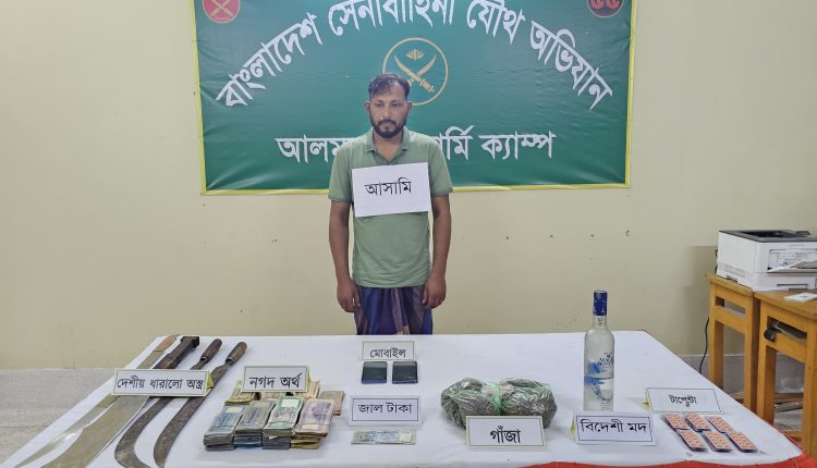 স্টাফ রিপোর্টার:চুয়াডাঙ্গা জেলার আলমডাঙ্গা উপজেলায় সেনাবাহিনী ও পুলিশের যৌথ বাহিনীর অভিযানে বিপুল পরিমাণ মাদকদ্রব্য, দেশীয় ধারালো অস্ত্র এবং জাল নোট সহ নগদ অর্থ উদ্ধার করা হয়েছে। অপারেশন ৩৬ এডি’ নামে অভিযানে