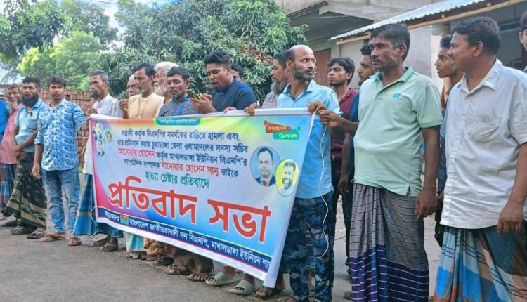 স্টাফ রিপোর্টার: চুয়াডাঙ্গা সদর উপজেলার মাখালডাঙ্গা ইউনিয়ন বিএনপির সাংগঠনিক সম্পাদক সানোয়ার হোসেন সানুকে হত্যাচেষ্টা ও বিএনপি সমর্থকের বাড়িতে হামলার ঘটনায় প্রতিবাদসভা অনুষ্ঠিত হয়েছে। গত পরশু শুক্রবার বিকেল ৫টায় মাখালডাঙ্গা ইউনিয়নের কুকিয়া চাঁদপুর বাজারে এই প্রতিবাদ সভা অনুষ্ঠিত হয়। মাখালডাঙ্গা ইউনিয়ন যুবদল নেতা আব্দুল হাকিমের সঞ্চালনায় প্রতিবাদ সভায় সভাপতিত্ব করেন মাখালডাঙ্গা ইউনিয়নের ৪নং ওয়ার্ড বিএনপির সভাপতি হানেফ মিয়া। প্রতিবাদ সভায় বক্তব্য রাখেন ভুক্তভোগী মাখালডাঙ্গা ইউনিয়ন বিএনপির সাংগঠনিক সম্পাদক সানোয়ার হোসেন সানু। অন্যান্যদের মধ্যে আরও বক্তব্য রাখেন ইউনিয়ন যুবদল নেতা সোহেল মাহমুদ, ইউনিয়ন যুবদল নেতা আব্দুল হাকিম, ইউনিয়ন ছাত্রদল নেতা আয়মান হাসিব প্রমুখ। সমাবেশে চুয়াডাঙ্গা জেলা ওলামা দলের সদস্য সচিব আনোয়ার হোসেনের বিরুদ্ধে নানা অভিযোগ তুলে তাকে সংগঠন থেকে বহিষ্কারের দাবি জানানো হয়। এছাড়া উপস্থিত ছিলেন মাখালডাঙ্গা ইউনিয়নের ৪নং ওয়ার্ড বিএনপির সেক্রেটারি করম আলী, সাবেক সদর থানা যুবদলের সদস্য জাহাঙ্গীর আলম, যুবদল নেতা ইমরান মাহমুদ, ইউনিয়ন যুবদল নেতা লাল্টু মিয়া, ওয়ার্ড বিএনপি নেতা সমির, মকবুল, আসাদ, নুর ইসলাম, ওয়ার্ড যুবদল নেতা জুবায়ের আহমেদ, হৃদয় হাসান, মহিন আলী, হাশর, আলম, নুরুজ্জামান, আলী, জামালসহ অনেকে।