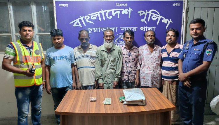 স্টাফ রিপোর্টার: চুয়াডাঙ্গায় জুয়া খেলার সরঞ্জামাদি ও নগদ টাকাসহ ৬ জুয়াড়িকে গ্রেফতার করেছে সদর থানার পুলিশ। গত পরশু মঙ্গলবার দিবাগত রাতে সদর উপজেলার ডিঙ্গেদহ টাওয়ারপাড়া এলাকা থেকে তাদেরকে আটক করা হয়। গতকালই তাদের আদালতে সোপর্দ করা হয়েছে। পুলিশ জানিয়েছে, গোপন সংবাদের ভিত্তিতে গত পরশু মঙ্গলবার দিনগত রাত পৌনে ১১টার দিকে চুয়াডাঙ্গা সদর থানার এসআই মাসুদ রানা সঙ্গীয় ফোর্সসহ সদর উপজেলার ডিঙ্গেদহ গ্রামের টাওয়ার পাড়ায় অভিযান চালান। অভিযানকালে জুয়া খেলার বিভিন্ন সামগ্রীসহ আটক করা হয় দামুড়হুদা উপজেলার মদনা গ্রামের মৃত জলবক্স ম-লের ছেলে বিশারত আলী (৫৫), সদর উপজেলার ডিঙ্গেদহ বাজারপাড়ার আক্তার মোল্যার ছেলে মিলন মোল্যা (৩২), ডিঙ্গেদহ মানিকদি পাড়ার মৃত ফকির চাঁন মন্ডলের ছেলে সোহরাব (৫৮), মৃত সৈয়দ আলীর ছেলে রিপন হোসেন (৩৫), মৃত আহম্মেদের ছেলে আহসান (৪২) ও মৃত আছির উদ্দিন মন্ডলের ছেলে খোকন (৫০)। এ সময় উদ্ধার করা হয় নগদ ৩ হাজার ২৫০ টাকা। আটককৃত ৬ জনকে জুয়া আইনে মামলাসহ গতকালই আদালতে সোপর্দ করা হয়েছে।