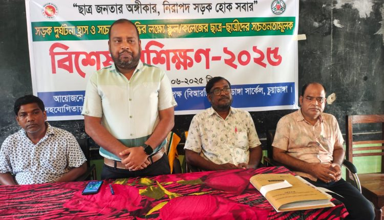 স্টাফ রিপোর্টার: ‘ছাত্র-জনতার অঙ্গীকার, নিরাপদ সড়ক হোক সবার’ স্লোগান নিয়ে চুয়াডাঙ্গায় সড়ক নিরাপত্তা বিষয়ে শিক্ষার্থীদের নিয়ে আলোচনা সভা অনুষ্ঠিত হয়েছে। গতকাল সোমবার দুপুরে চুয়াডাঙ্গার শহরতলী দৌলতদিয়াড় সরকারি প্রাথমিক বিদ্যালয়ে এ আলোচনা সভা অনুষ্ঠিত হয়। বাংলাদেশ সড়ক পরিবহন কর্তৃপক্ষ (বিআরটিএ) চুয়াডাঙ্গা সার্কেলের আয়োজনে এ আলোচনা সভা হয়। অনুষ্ঠানে উপস্থিত ছিলেন বিআরটিএ চুয়াডাঙ্গা সার্কেলের মোটরযান পরিদর্শন নজরুল ইসলাম, দৌলতদিয়াড় সরকারি প্রাথমিক বিদ্যালয়ের প্রধান শিক্ষক রেজাউল কবির, নিরাপদ সড়ক চাই- নিসচা চুয়াডাঙ্গা জেলা শাখার সাধারণ সম্পাদক জাকির হোসেন ও বিদ্যালয়ের সহকারী শিক্ষক শামীম হোসেন। আলোচনা সভায় বক্তারা নিরাপদ সড়কের গুরুত্ব, রোড সাইন, রাস্তা পারাপার, ওভারব্রীজ ব্যবহার বিষয়ে বিস্তারিত আলোচনা করেন। এসময় শিক্ষক-শিক্ষার্থীদের মাধ্যমে সামাজিক সচেতনতার উপর গুরুত্বারোপ করা হয় এবং সড়কে নিরাপদ চলাচল, সাইকেল চালানো বিষয়ে আলোচনা করা হয়। প্রশিক্ষণে বিদ্যালয়ের ৭০ শিক্ষার্থী অংশগ্রহণ করে।