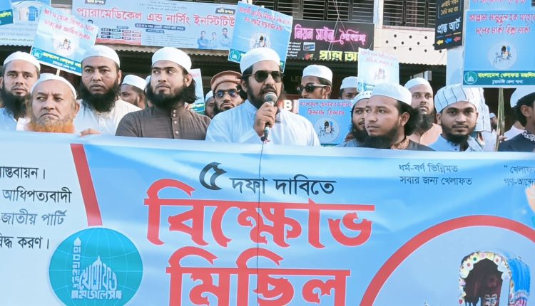 স্টাফ রিপোর্টার:জুলাই সনদের বাস্তবায়ন, আওয়ামী লীগের দোসর ও ভারতের এজেন্ট হিসেবে বিবেচিত জাতীয় পার্টি ও ১৪ দলের রাজনীতি নিষিদ্ধ করণ, আগামী নির্বাচনে লেভেল প্লেইং ফিল্ড তৈরি, জুলাই গণহত্যার বিচার দৃশ্যমান ও জাতীয় সংসদে উচ্চকক্ষ গঠন ও পিআর পদ্ধতি বাস্তবায়নের দাবিতে চুয়াডাঙ্গায় বিক্ষোভ সমাবেশ করেছে বাংলাদেশ খেলাফত মজলিস।