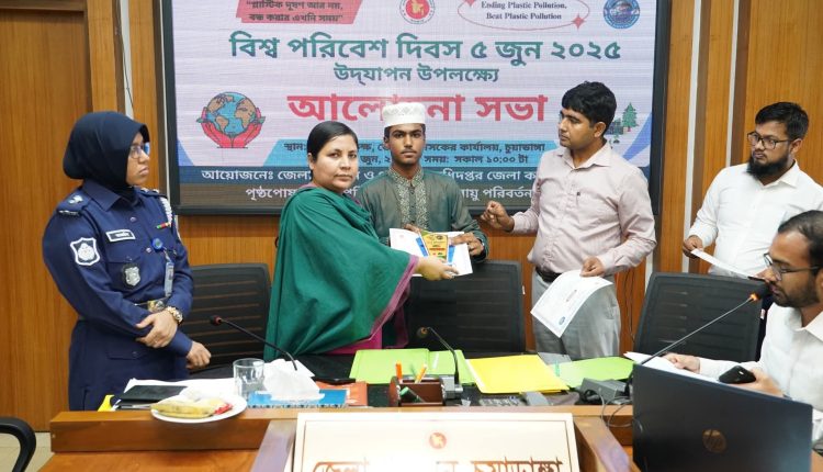 চুয়াডাঙ্গায় বিশ্ব পরিবশে দিবস উদযাপন করা হয়েছে। জেলা প্রশাসন ও পরিবেশ অধিদপ্তর জেলা কার্যালয়ের যৌথ আয়োজনে এবং পরিবেশ বন ও জলবায়ু পরিবর্তন মন্ত্রণালয়ের পৃষ্ঠপোষকতায় আলোচনাসভা অনুষ্ঠিত হয়। অনুষ্ঠানের শুরুতেই দৈনন্দিন জীবনে প্লাস্টিকের ব্যবহার এবং এর পরিবেশগত প্রভাব সম্পর্কে সচেতনতা বৃদ্ধির লক্ষ্যে একটি পাওয়ার পয়েন্ট প্রেজেন্টেশন উপস্থাপন করা হয়। আলোচনাসভায় প্রধান অতিথি ছিলেন চুয়াডাঙ্গা স্থানীয় সরকারের উপপরিচালক (ভারপ্রাপ্ত) শারমিন আক্তার। অনুষ্ঠানের সঞ্চালনায় ছিলেন সহকারী কমিশনার ও এক্সিকিউটিভ ম্যাজিস্ট্রেট মো. আশফাকুর রহমান। অনুষ্ঠানে উপস্থিত ছিলেন চুয়াডাঙ্গা গণপূর্ত বিভাগের নির্বাহী প্রকৌশলী মহাসিন আলী, সহকারী পুলিশ সুপার তাজরিনা সুলতানা, বৈষম্যবিরোধী ছাত্র আন্দোলনের চুয়াডাঙ্গা জেলা শাখার আহ্বায়ক আসলাম হোসেন অর্ক, মুখ্য সংগঠক সজীবুল ইসলাম, চুয়াডাঙ্গা ইটভাটা মালিক সমিতির সভাপতি খাজা নাসির উদ্দিন শান্তি, সাধারণ সম্পাদক আব্দুল মোতালেব প্রমুখ। উন্মুক্ত আলোচনায় বক্তব্য রাখেন প্রথম আলোর সাংবাদিক শাহ আলম সনি ও মানবতার জন্য স্বেচ্ছাসেবী সংগঠনের পক্ষ থেকে বক্তব্য রাখেন প্রভাষক আহসান হাবিব শিপলু। আলোচনা অনুষ্ঠান শেষে দিবসটি উপলক্ষ্যে আয়োজিত চিত্রাঙ্কন ও রচনা প্রতিযোগিতার বিজয়ীদের মধ্যে পুরস্কার হিসেবে ক্রেস্ট ও সনদপত্র বিতরণ করা হয়। অনুষ্ঠানটি আয়োজন করেন চুয়াডাঙ্গা জেলা প্রশাসন ও পরিবেশ অধিদপ্তর।
